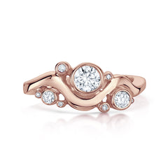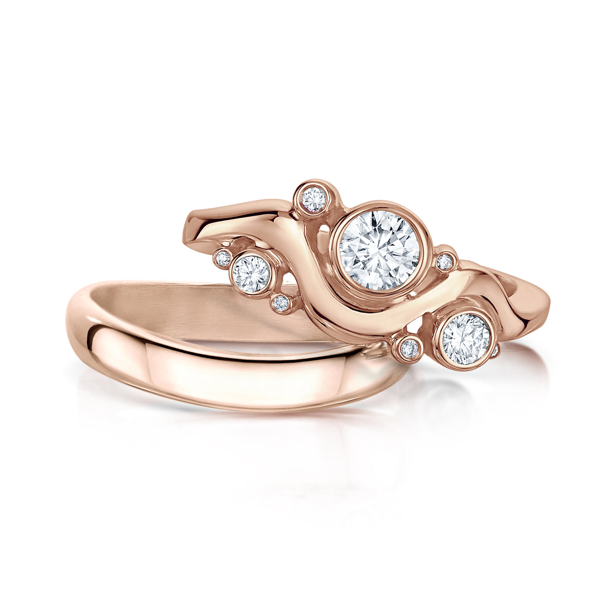 This ring set in warm 9ct rose gold combines Sheila’s Cosmos Constellation diamond ring with her elegantly curved Cosmos Constellation plain band, both rings beautifully hand-finished in our Orkney workshop. The diamond ring in enduring and luxurious platinum features a sparkling 4.5mm/0.35ct diamond surrounded by a further eight diamonds, sized from 3mm down to 0.8mm. The total carat weight of the nine diamonds is just over a half-carat (0.516ct). The diamond ring is beautifully complemented by a matching curved band, also in 9ct rose gold.