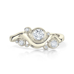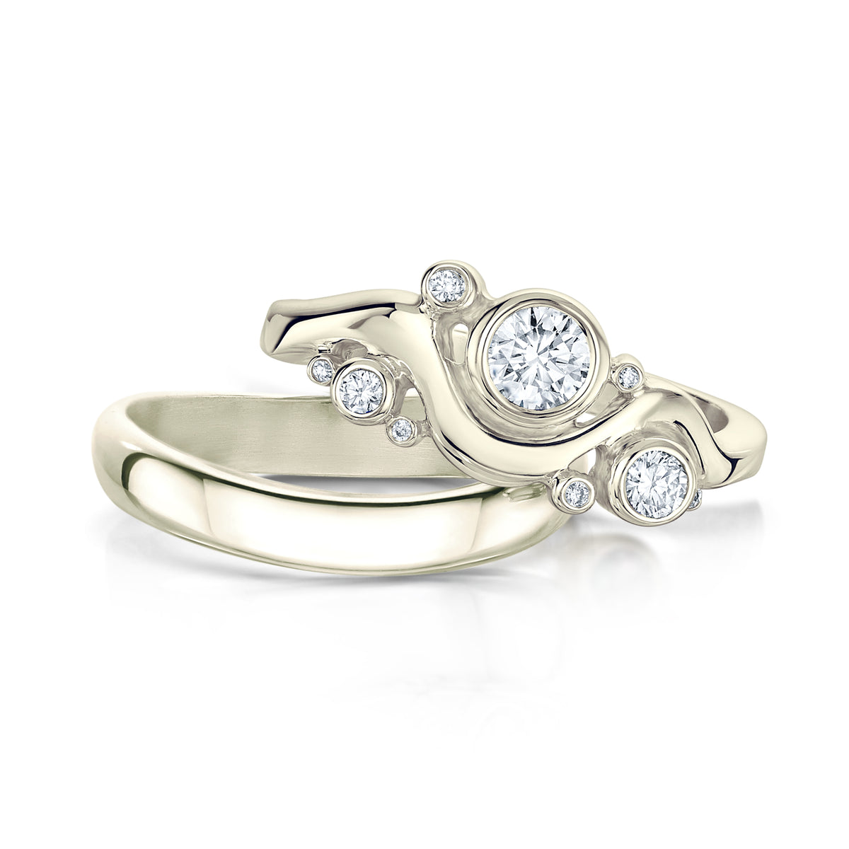 This ring set in elegant 9ct white gold combines Sheila’s Cosmos Constellation diamond ring with her elegantly curved Cosmos Constellation plain band, both rings beautifully hand-finished in our Orkney workshop. The diamond ring in enduring and luxurious platinum features a sparkling 4.5mm/0.35ct diamond surrounded by a further eight diamonds, sized from 3mm down to 0.8mm. The total carat weight of the nine diamonds is just over a half-carat (0.516ct). The diamond ring is beautifully complemented by a matching curved band, also in 9ct white gold.