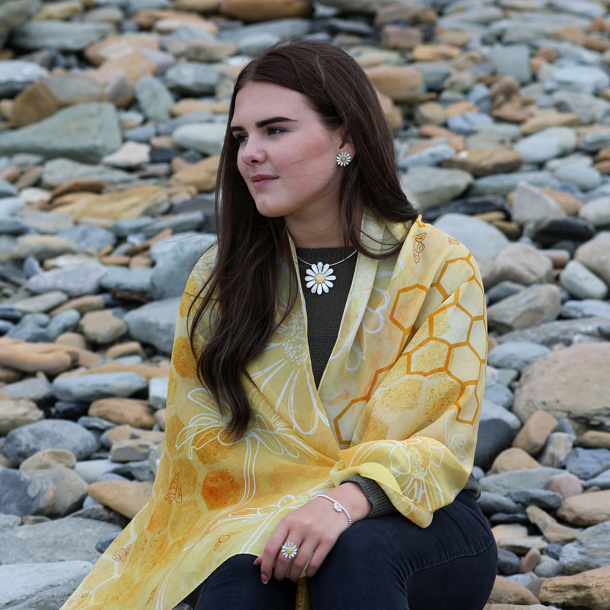• This Daisies at Dawn Necklace in sterling silver features a stunning daisy, hand-enamelled in ‘Sunshine’ enamel, and elegantly hanging from a silver neckwire. The design is approximately 45mm wide and is hand-finished in our Orkney workshop.