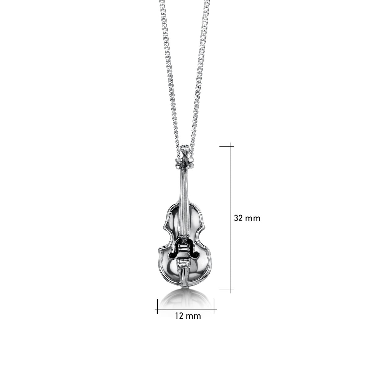 • This Fiddle pendant in oxidised sterling silver features a hand-finished violin, measuring approximately 12mm by 32mm, hanging from a sterling silver curb chain. The fiddle is hollow, just like the real thing, with the f-holes, fingerboard, and tuning pegs all captured in exquisite detail.