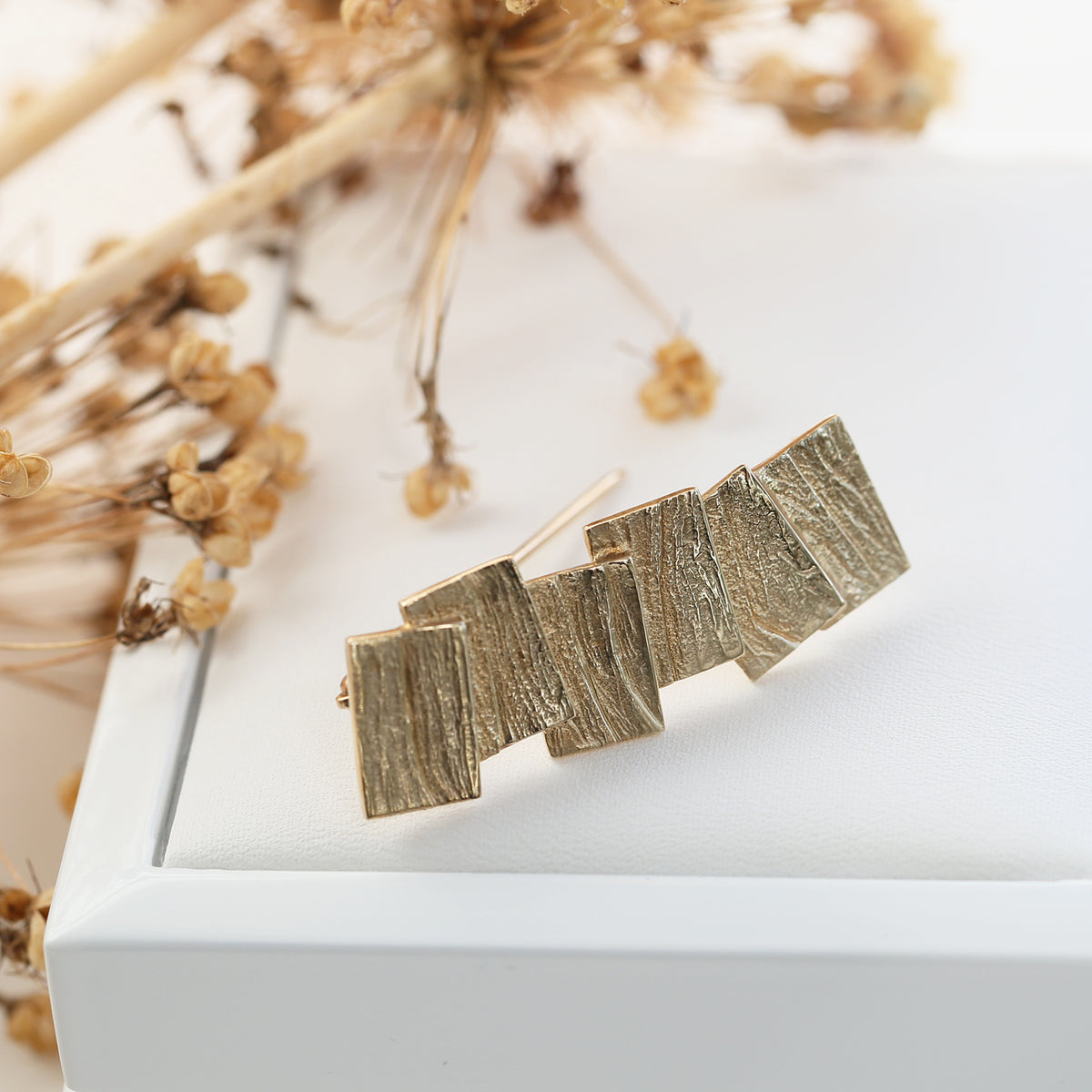 This Flagstone brooch in classic 9ct yellow gold features slabs of textured gold, beautifully hand-finished in our Orkney workshop. The design measures approximately 40mm by 14mm.