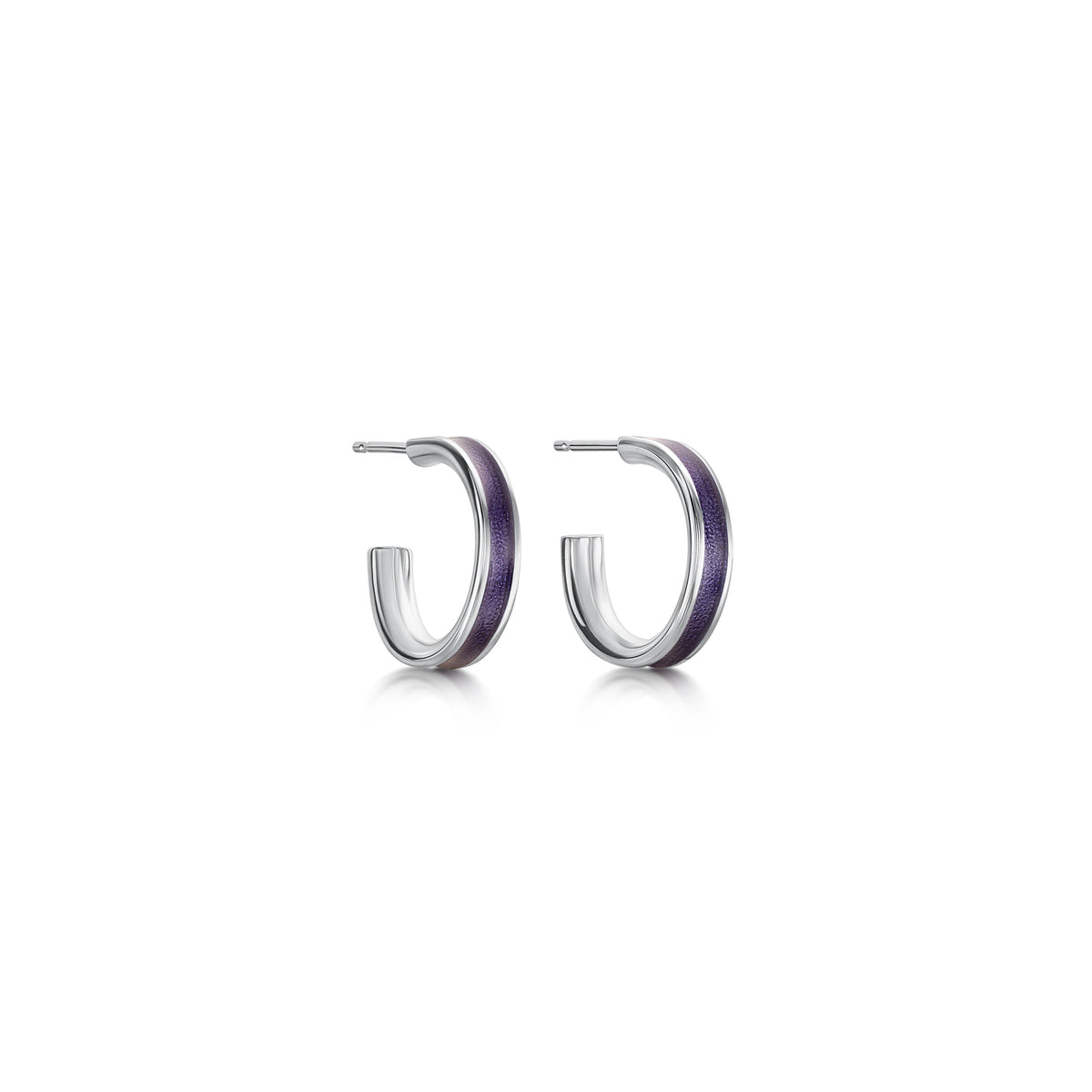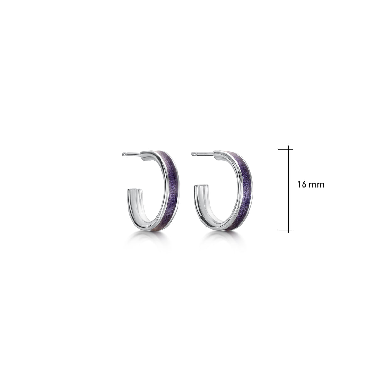 These Halo huggie earrings in sterling silver are hand-enamelled in our Orkney workshop in Purple enamel. The small hoops curve snuggly around the ear. They measure approximately 3mm wide and 17mm in diameter.