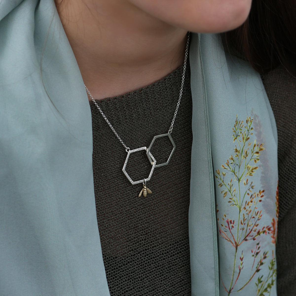 • This large sterling silver Honeycomb necklace features two interlinked, textured hexagons suspended between a silver chain. One of the hexagons is enhanced with a beautifully detailed 9ct yellow gold honeybee, hanging from the design. Each hexagon measures approximately 30mm by 37mm and the honeybee measures 12mm wide.