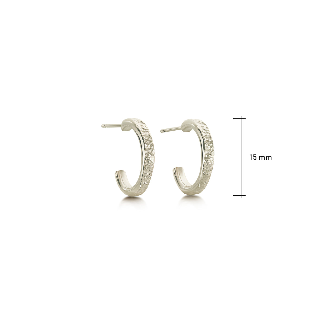 These small Matrix huggie hoop earrings in elegant 9ct white gold feature a textured 3mm band, hand-finished in our Orkney workshop. The small hoops curve snuggly around the ear. Each earring measures approximately 3mm wide and 15mm in diameter.