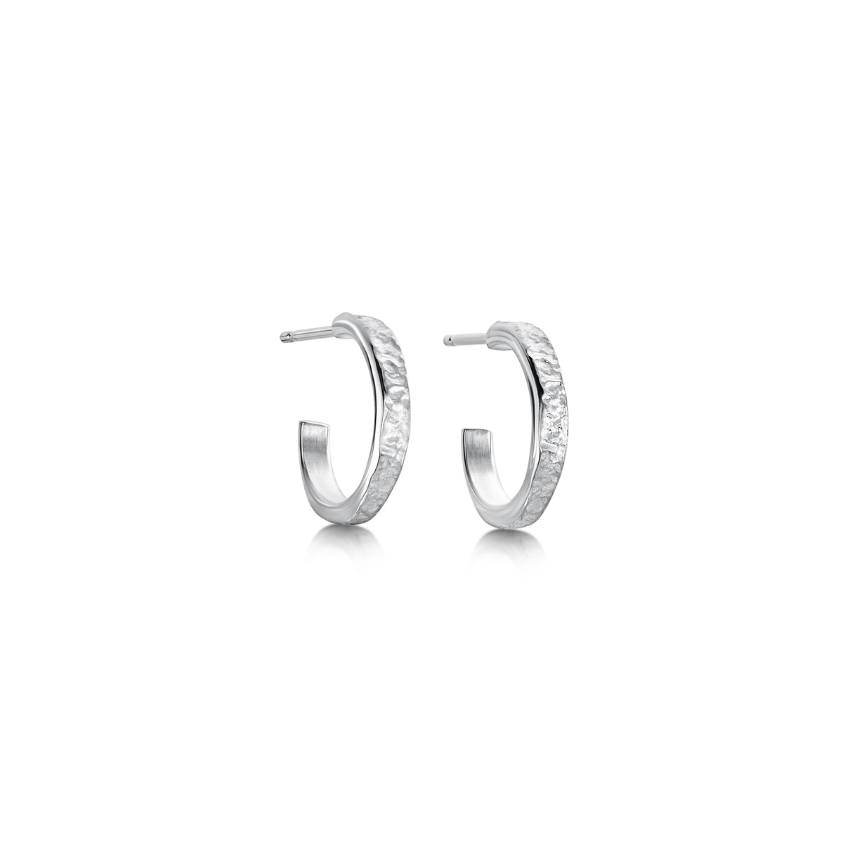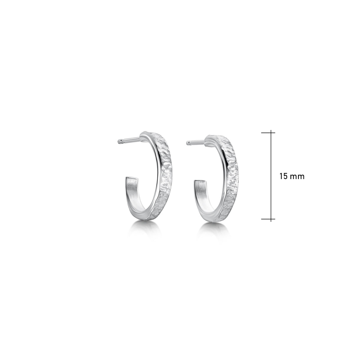 These small Matrix huggie hoop earrings in sterling silver feature a textured 3mm band, hand-finished in our Orkney workshop. The small hoops curve snuggly around the ear. Each earring measures approximately 3mm wide and 15mm in diameter.