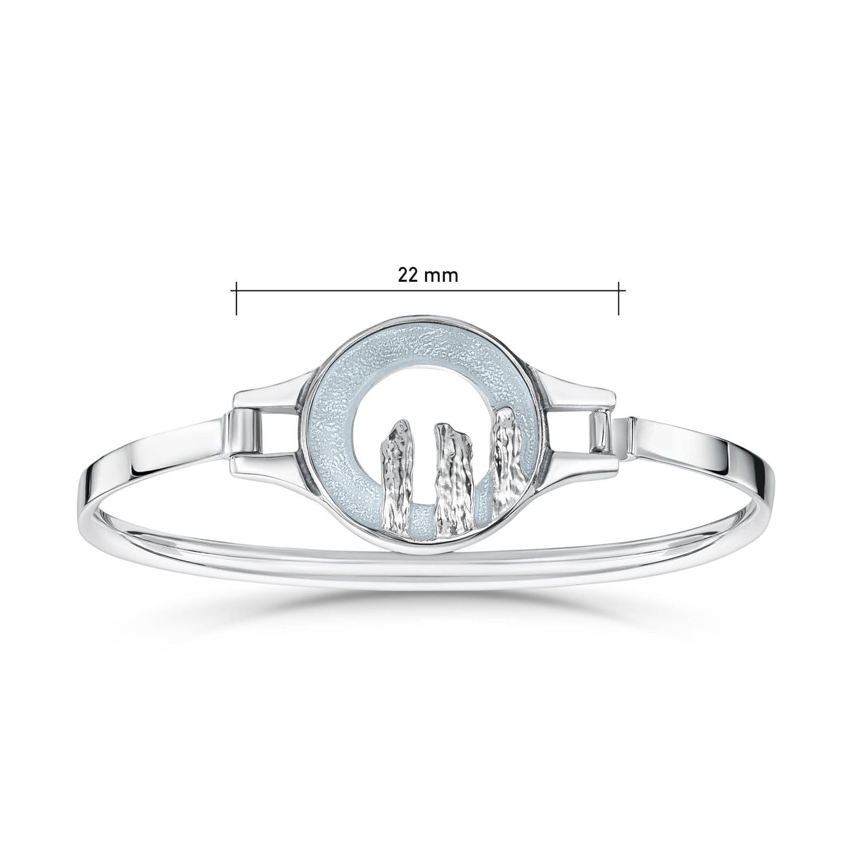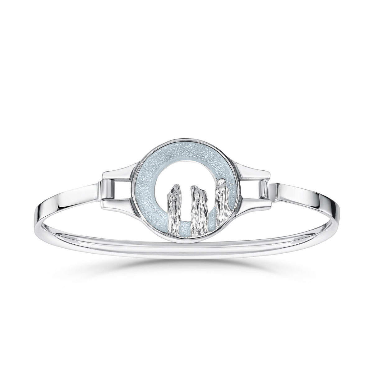 This Orkney Spirit hinged bangle in sterling silver features an iconic interpretation of Orkney's Neolithic standing stones, beautifully composed within a circular setting. The standing stones design is hand-enamelled in 'Dew' enamel and measures approximately 22mm in diameter.