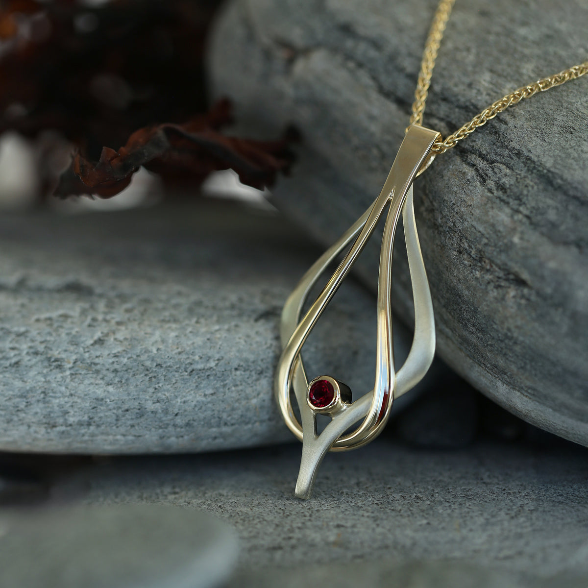 This Reef Knot dress necklace in classic 9ct white and yellow gold features a 4mm ruby expertly set by hand in our Orkney workshop. The design delicately drops from an 9ct yellow gold chain.