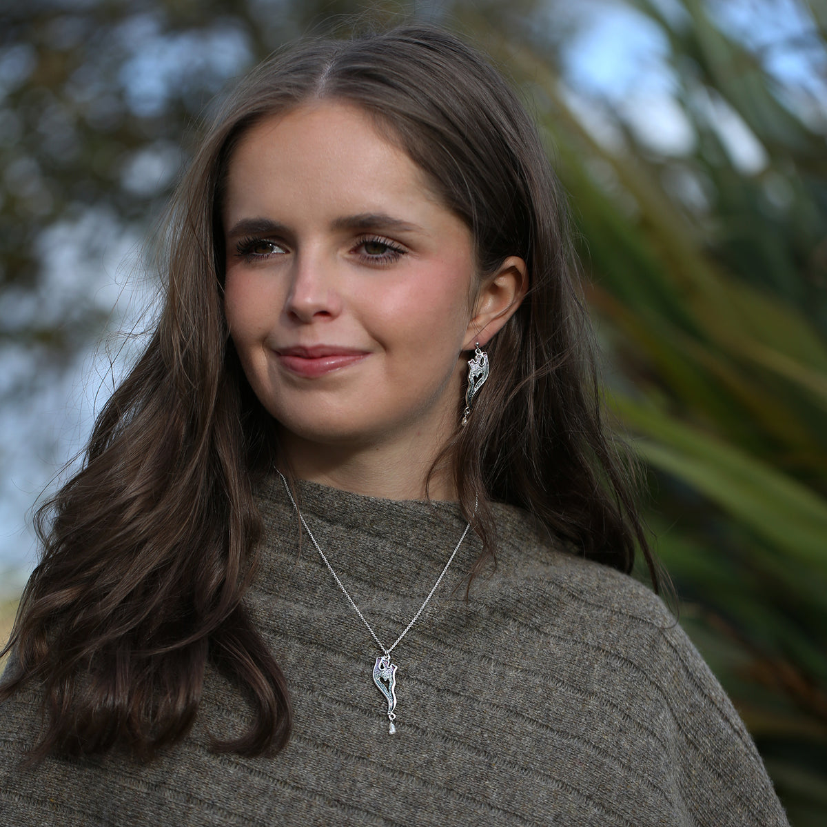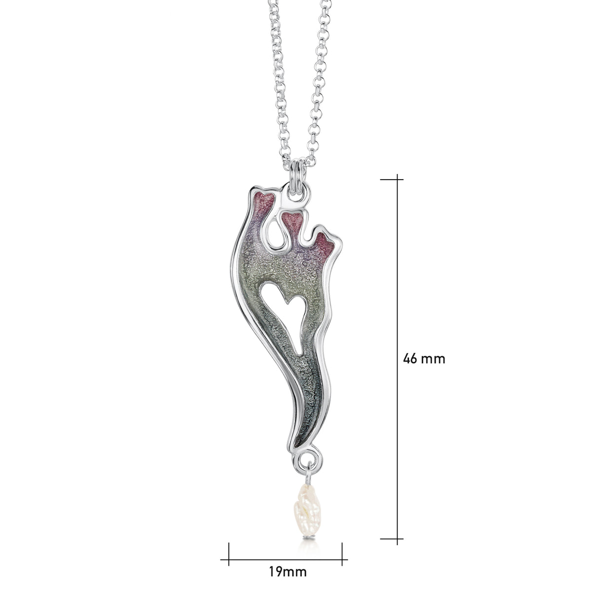 This Sea Moss pendant features a long seaweed-inspired design, beautifully highlighted in Sheila's Mill Sands enamel, and enhanced with a long freshwater rice pearl. The pendant design measures approximately 14mm by 34mm with a 45mm drop, and hangs elegantly from a silver bell chain.