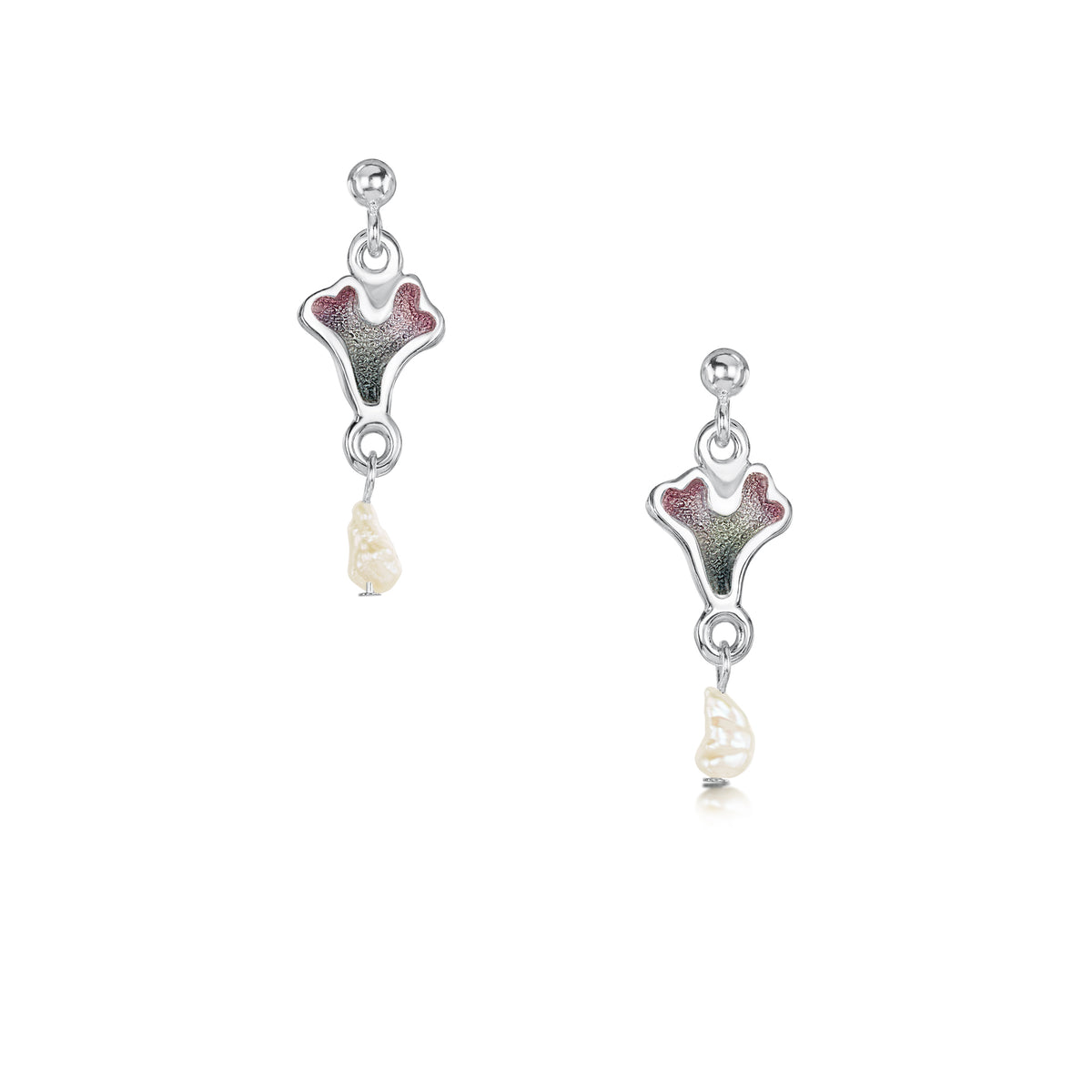 These silver Sea Moss drop earrings feature a small organic seaweed design, beautifully highlighted in Sheila's Mill Sands enamel, and enhanced with a long freshwater rice pearl. Each earring measures approximately 9mm wide with a 19mm drop.