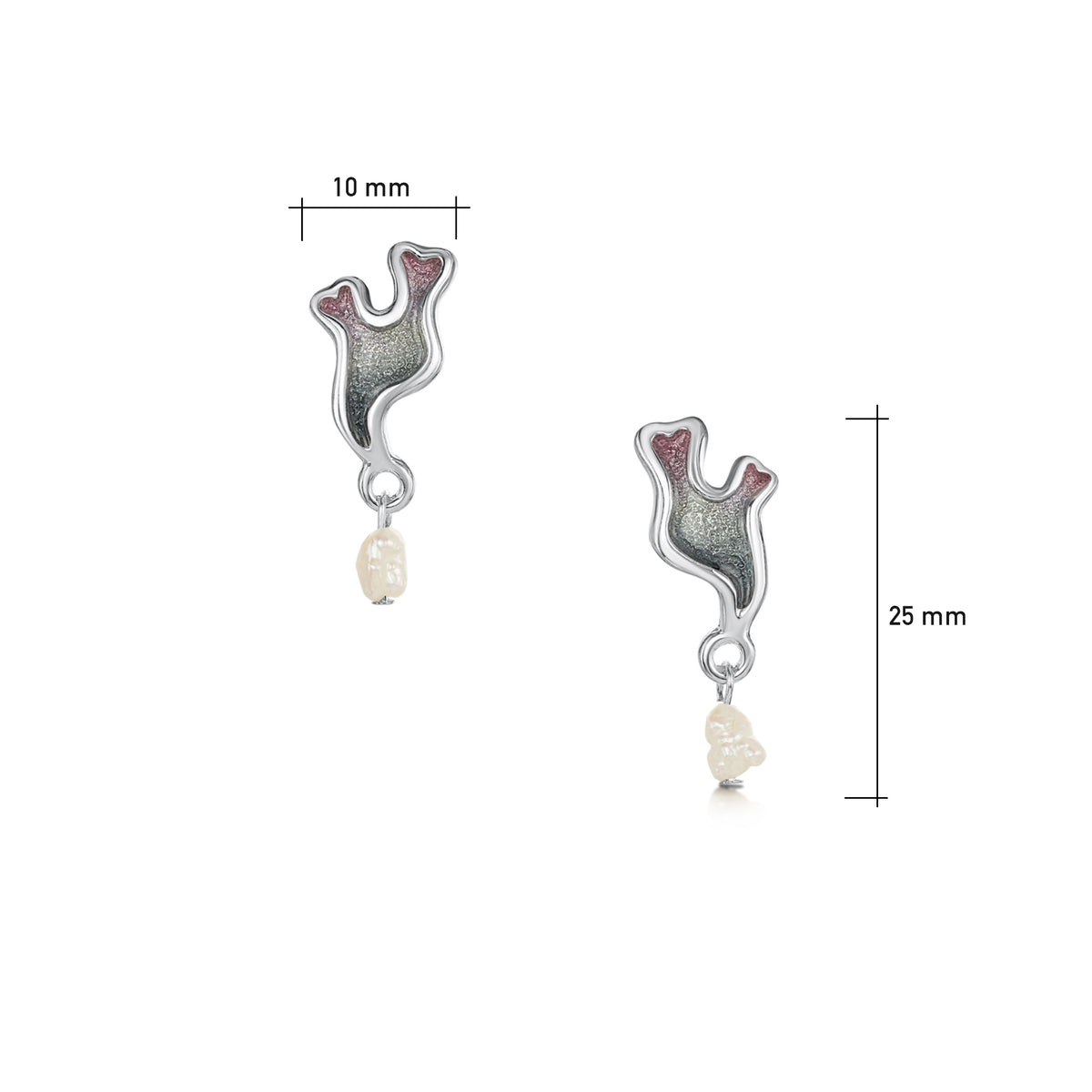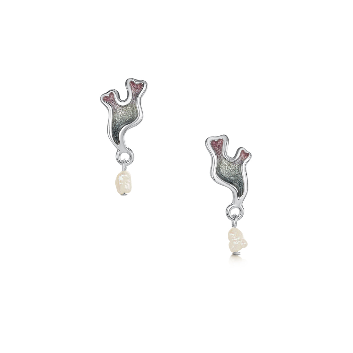 • These silver Sea Moss stud drop earrings feature a small organic seaweed design, beautifully highlighted in Sheila's Mill Sands enamel, and enhanced with a long freshwater rice pearl. Each earring measures approximately 9mm wide with a 25mm drop.