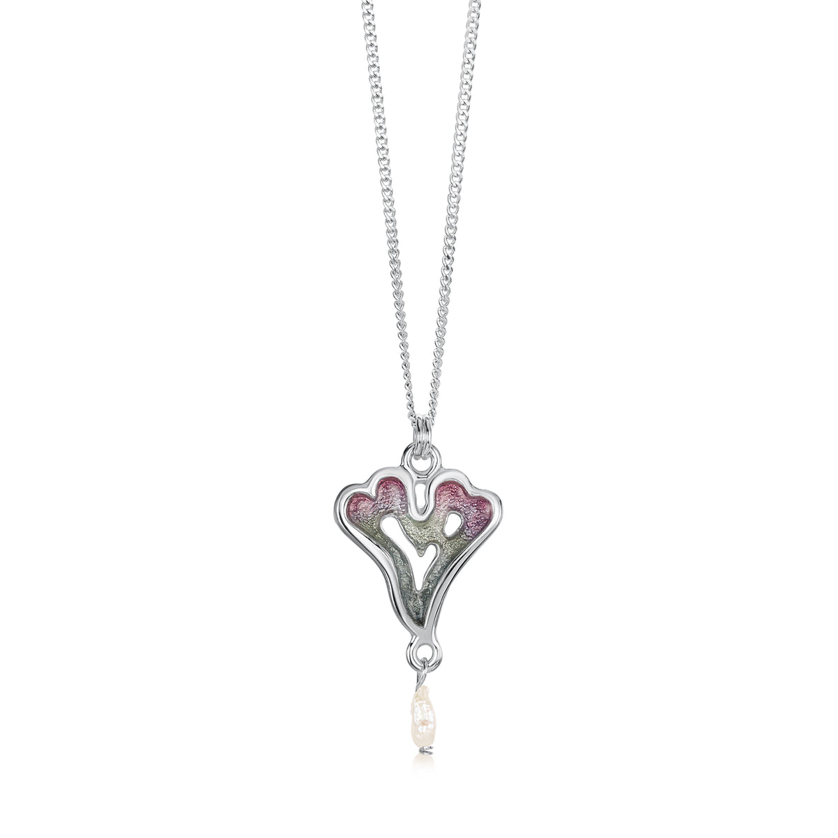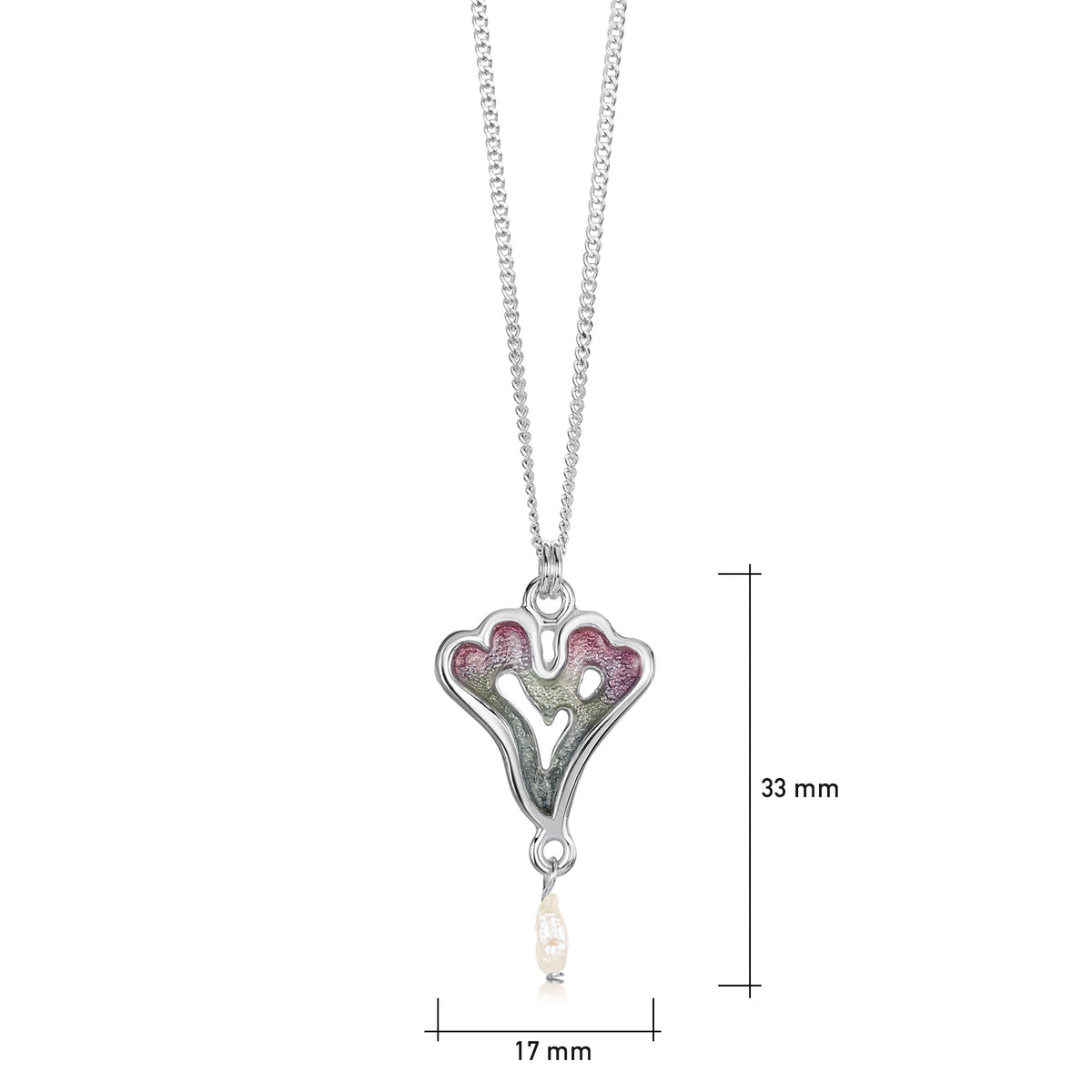 This Sea Moss pendant features a small heart-shaped seaweed design, beautifully highlighted in Sheila's Mill Sands enamel, and enhanced with a long freshwater rice pearl. The pendant design measures approximately 18mm by 18mm with a 30mm drop, and hangs elegantly from a silver curb chain.