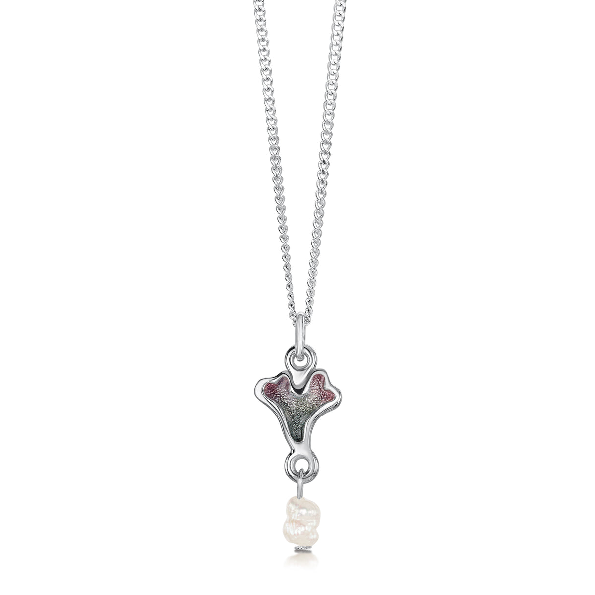 This Sea Moss pendant features a petite heart-shaped seaweed design, beautifully highlighted in Sheila's Mill Sands enamel, and enhanced with a long freshwater rice pearl. The pendant design measures approximately 9mm by 9mm with a 19mm drop, and hangs elegantly from a silver curb chain.