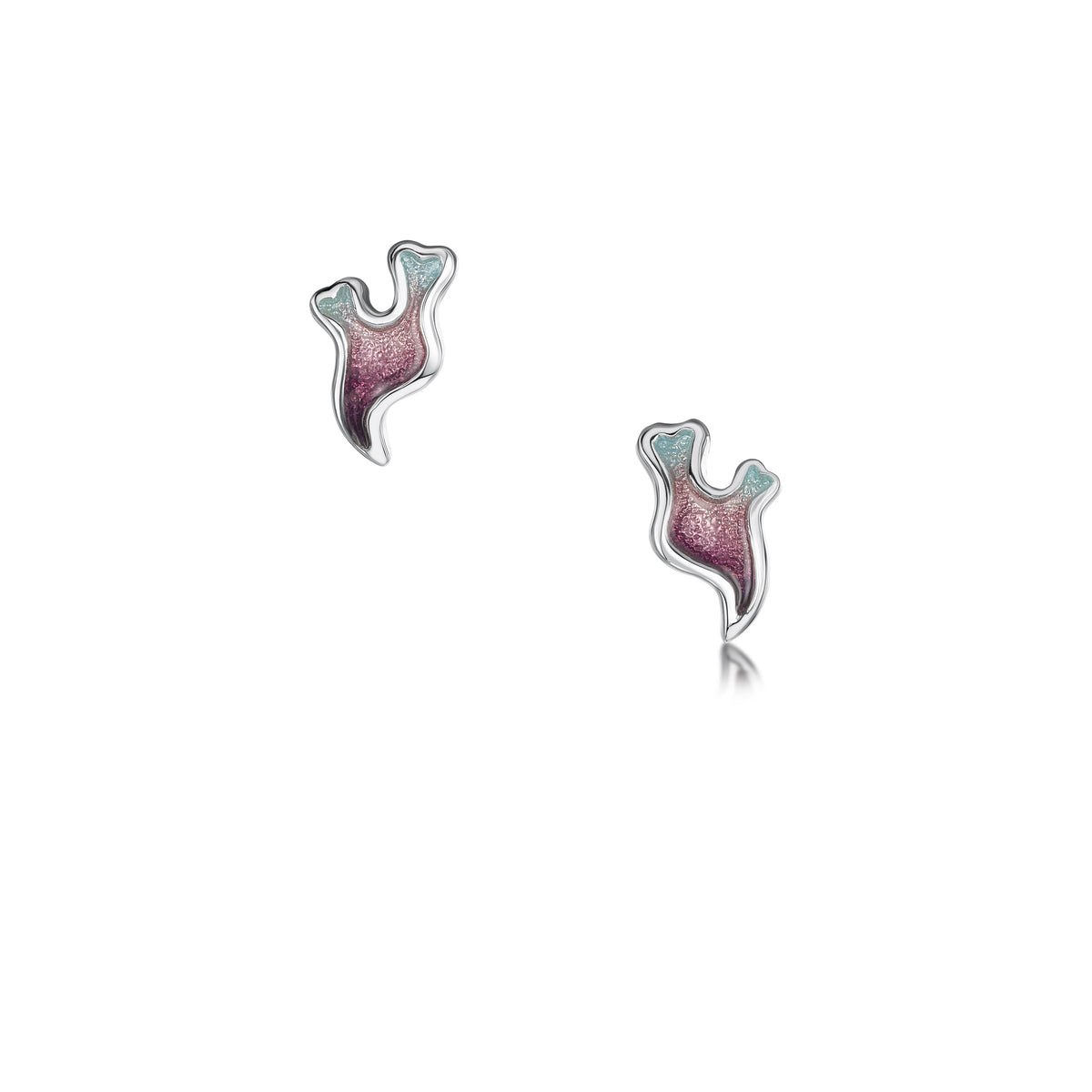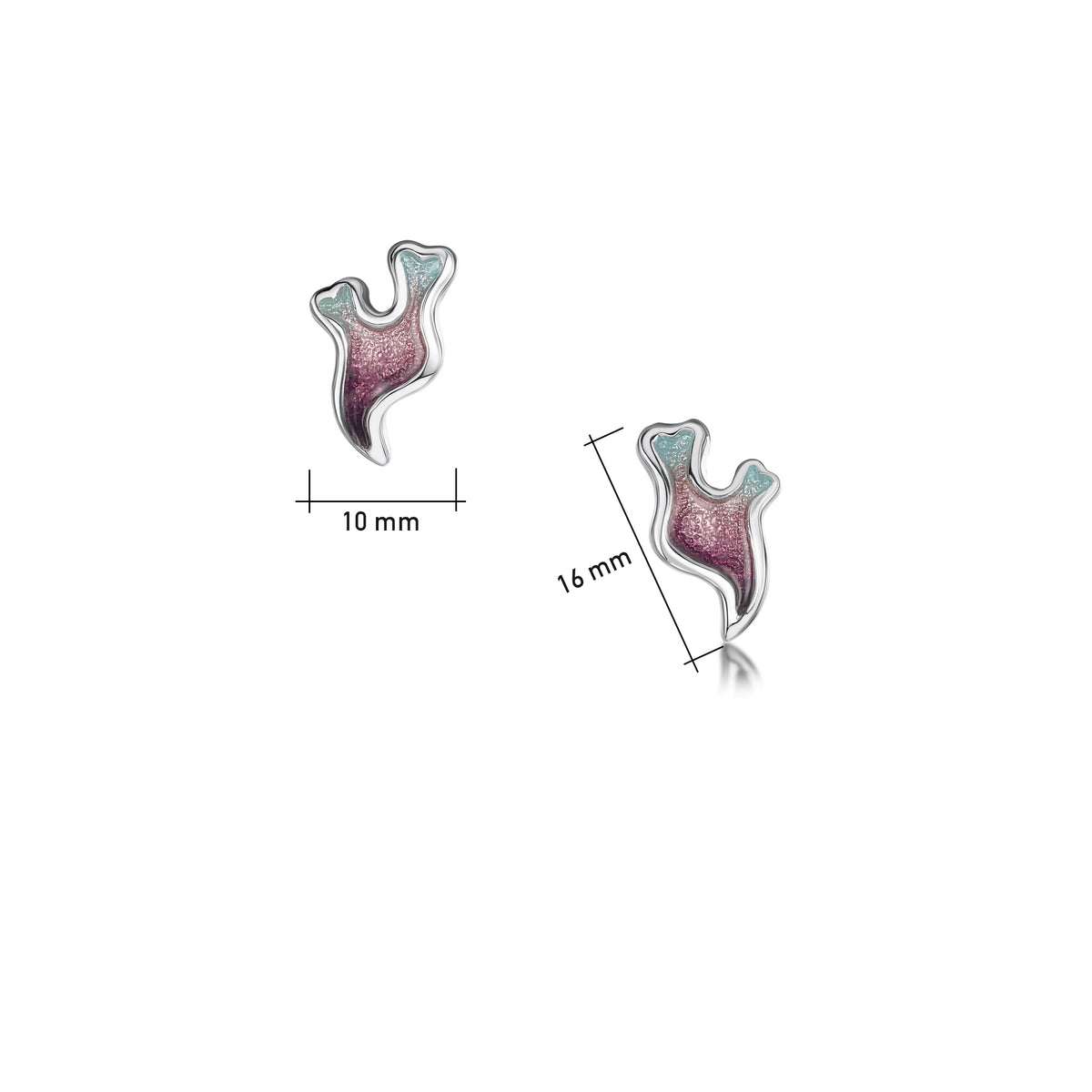 These silver Sea Moss stud earrings feature a small seaweed design, hand-enamelled in Sea Pink enamel in our Orkney workshop. Each earring measures approximately 9mm by 15mm.