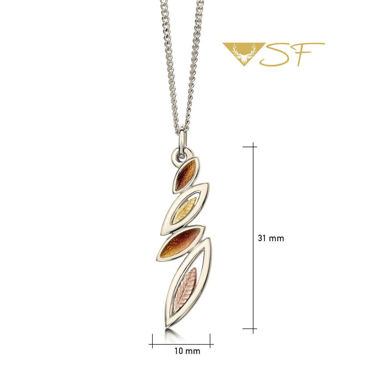 • This small Seasons pendant necklace in exclusive 18ct White Scottish Gold features four golden leaf-shape outlines, two of which contain 18ct Yellow and Rose Scottish Gold leaves, the other two highlighted in 'Autumn' enamel. The design measures approximately 10mm by 32mm and hangs from an 18ct white gold chain*.