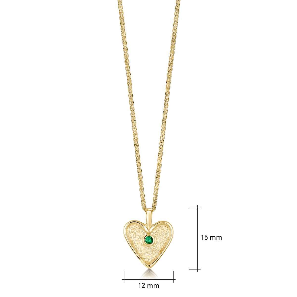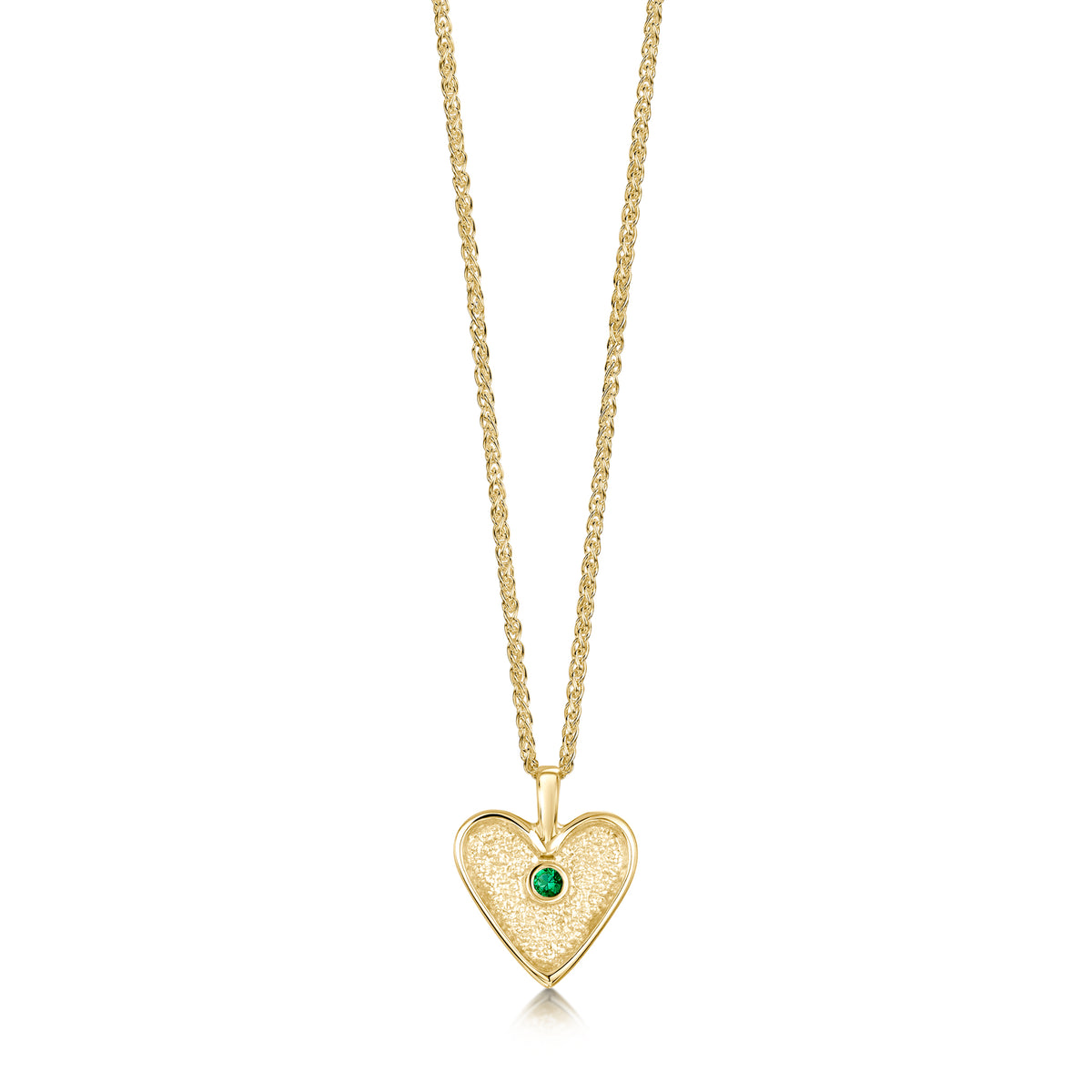 • This Secret Hearts pendant in classic 9ct yellow gold hangs delicately from a gold wheat chain. The golden heart is hand-set with a 2mm emerald in our Orkney workshop and measures approximately 12mm by 15mm.