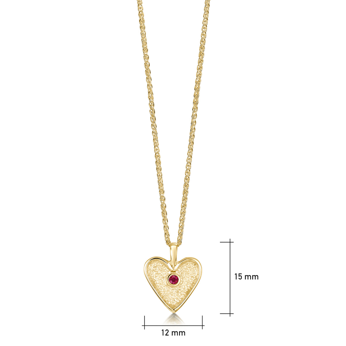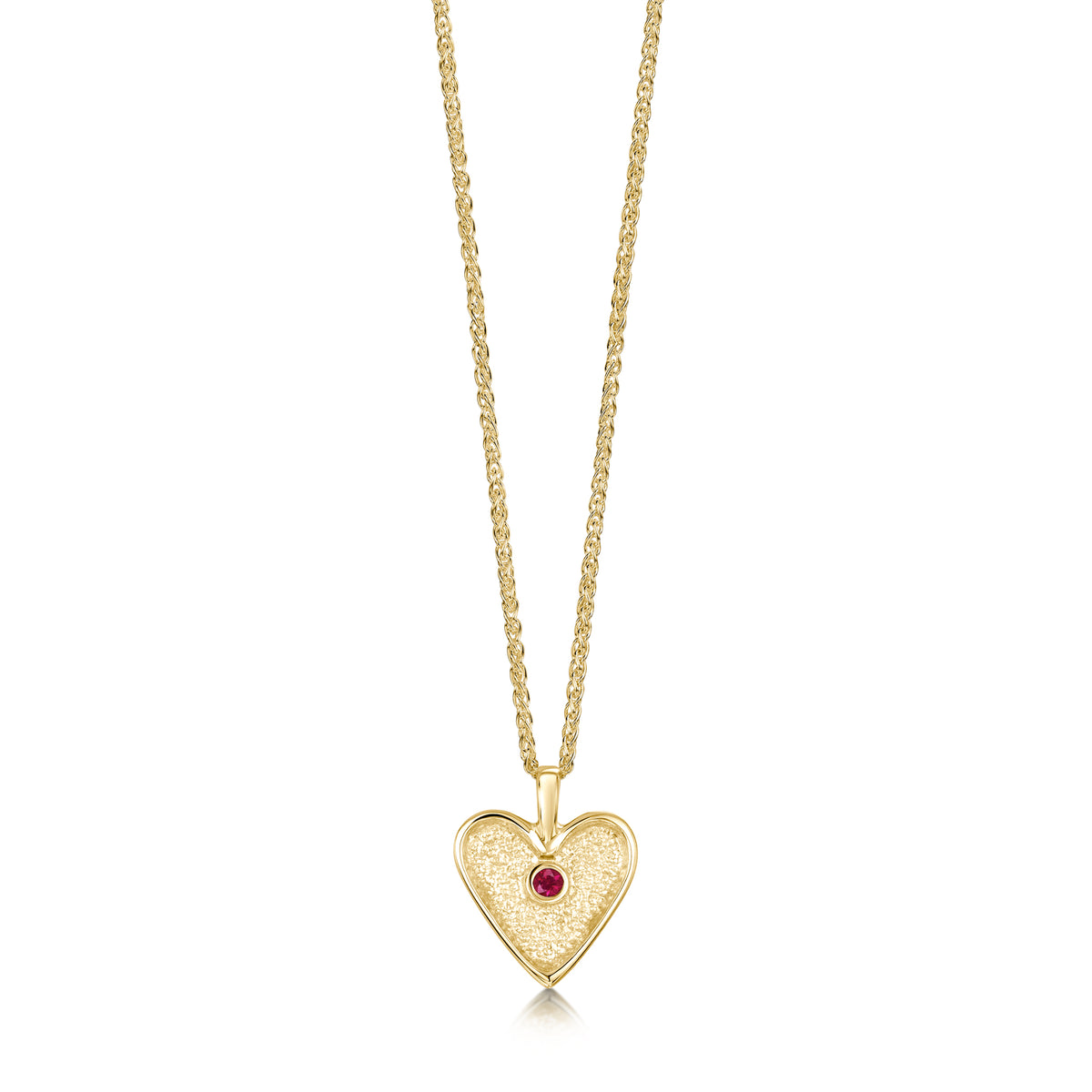 • This Secret Hearts pendant in classic 9ct yellow gold hangs delicately from a gold wheat chain. The golden heart is hand-set with a 2mm ruby in our Orkney workshop and measures approximately 12mm by 15mm.