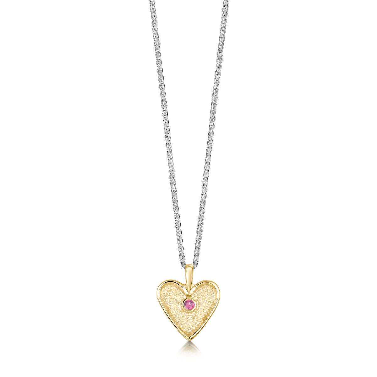 • This Secret Hearts pendant in classic 9ct yellow gold hangs delicately from a silver wheat chain. The golden heart is hand-set with a 2mm pink tourmaline in our Orkney workshop and measures approximately 12mm by 15mm.