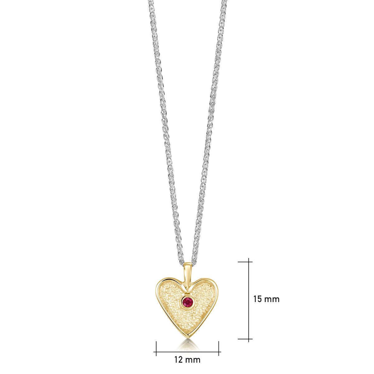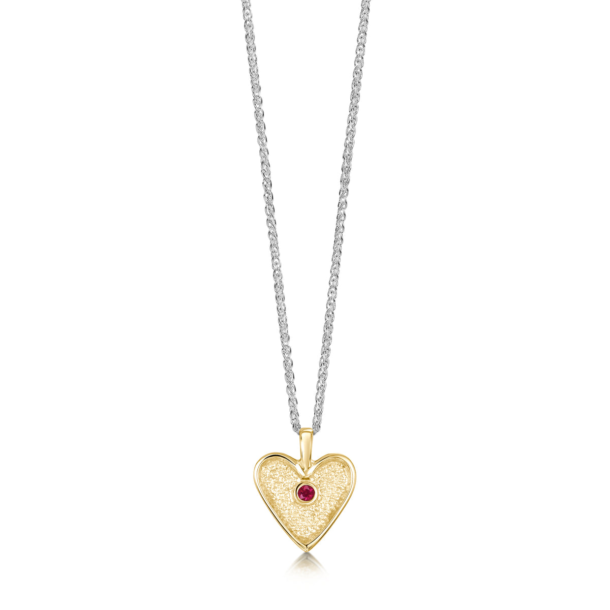 This Secret Hearts pendant in classic 9ct yellow gold hangs delicately from a silver wheat chain. The golden heart is hand-set with a 2mm ruby in our Orkney workshop and measures approximately 12mm by 15mm.