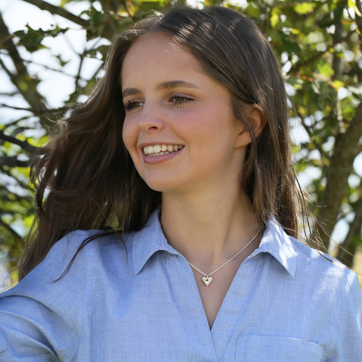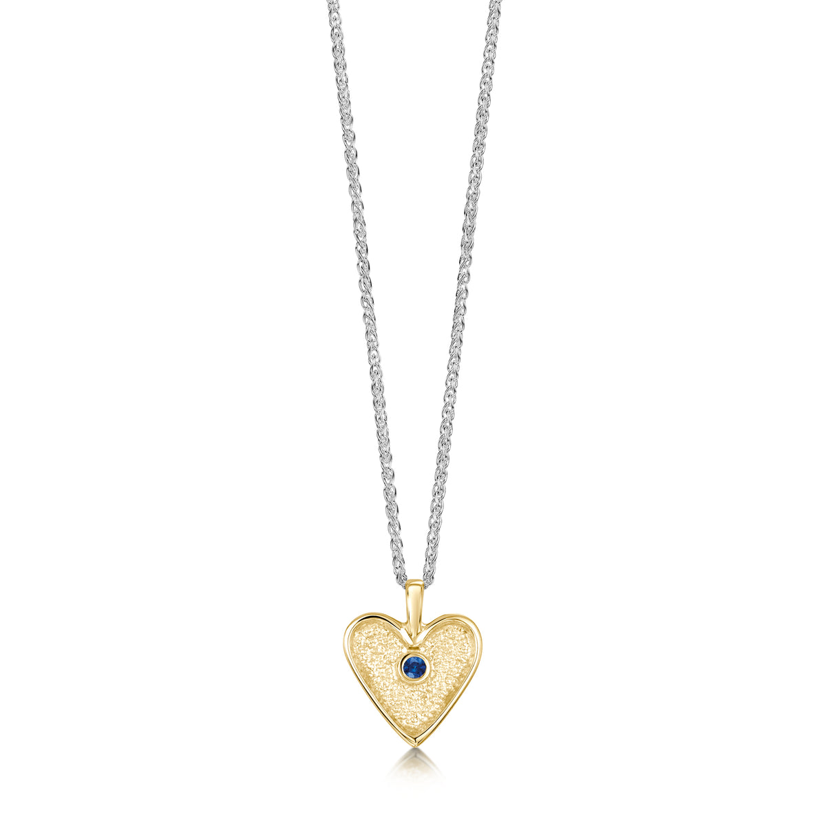 This Secret Hearts pendant in classic 9ct yellow gold hangs delicately from a silver wheat chain. The golden heart is hand-set with a 2mm sapphire in our Orkney workshop and measures approximately 12mm by 15mm.