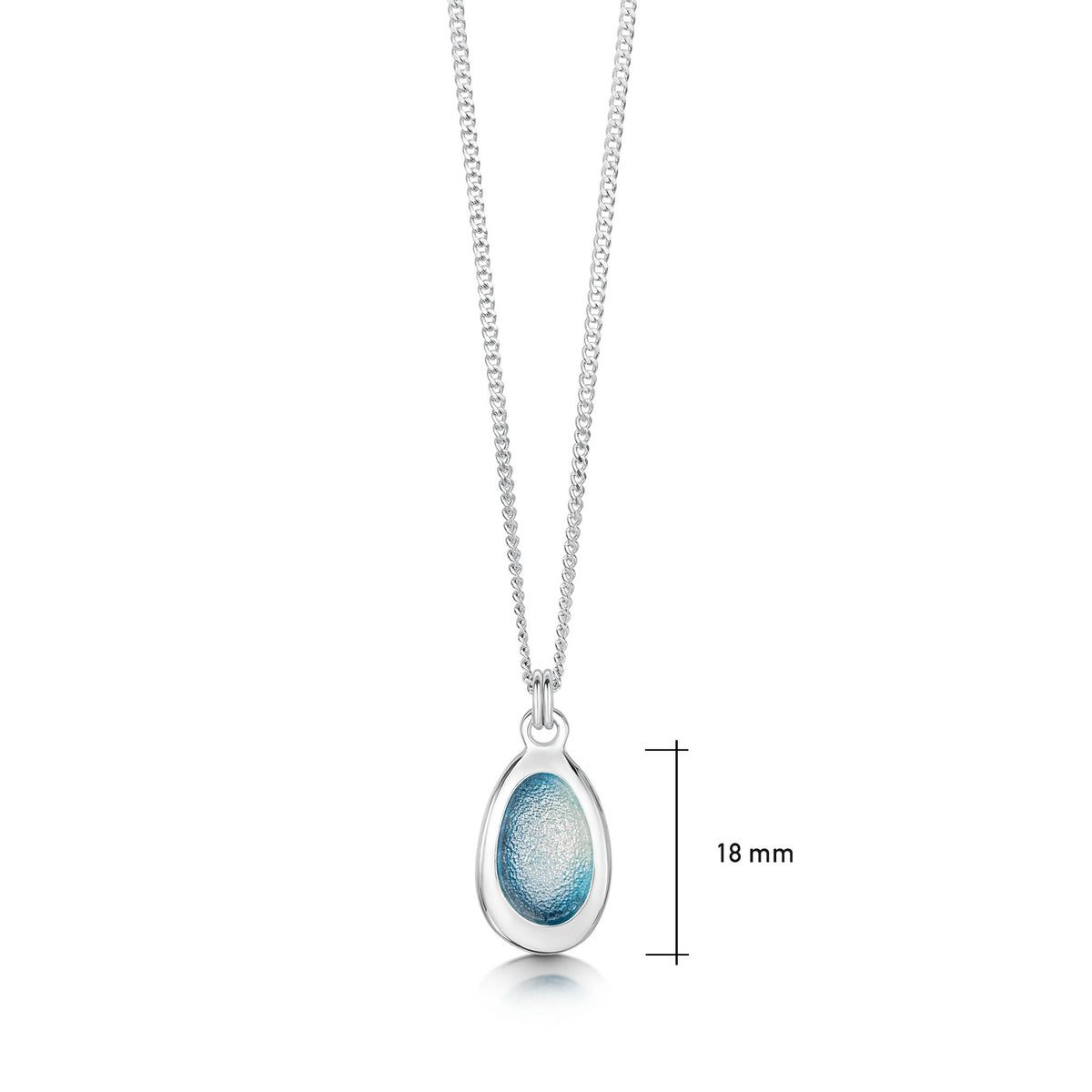 • This small Shoreline Pebble pendant in sterling silver features a single silver pebble shape, delicately hanging from a sterling silver curb chain. The design is hand-enamelled in our Orkney workshop in Blue Grey enamel to imitate the colour of sea-washed pebbles. The pendant piece measures approximately 7mm by 18mm.