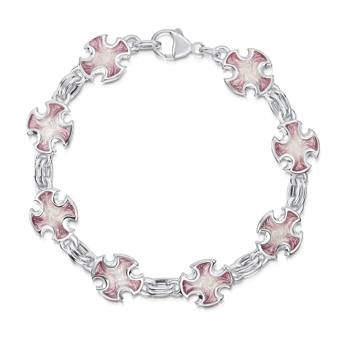 This sterling silver Sinclair Cross bracelet features eight cross-pattern designs interlinked with silver jump rings. Each cross is hand-enamelled in our Orkney workshop in Champagne enamel.