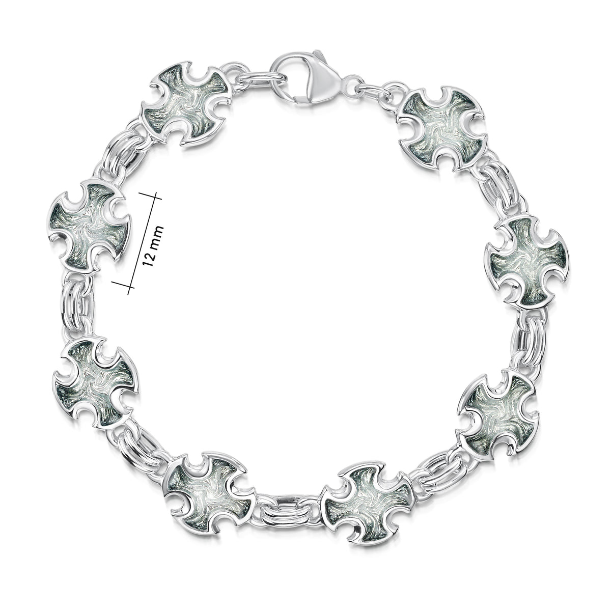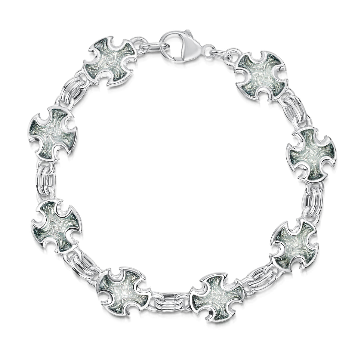 This sterling silver Sinclair Cross bracelet features eight cross-pattern designs interlinked with silver jump rings. Each cross is hand-enamelled in our Orkney workshop in Moss Grey enamel.