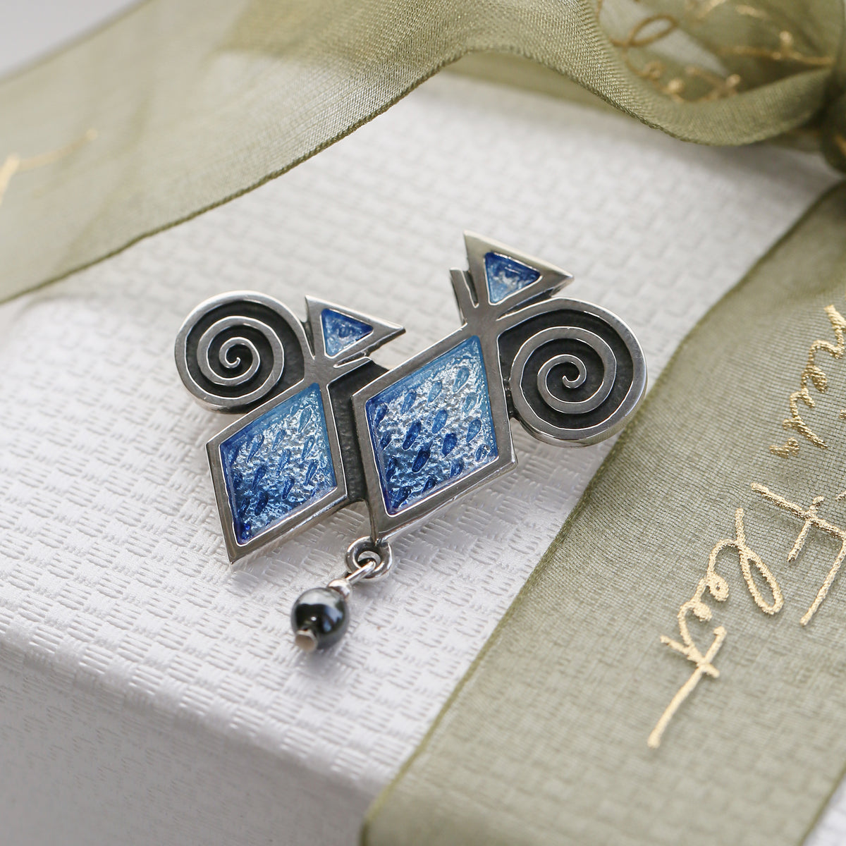 This Skara Urn dress brooch in sterling silver is part of Sheila's Skara Urn collection, and features a hand-enamelled spiral and geometric design. The brooch is enamelled in our Orkney workshop in Skaill enamel.