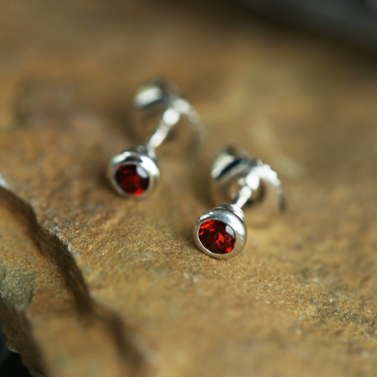 • These contemporary solitaire stud earrings in sterling silver are hand-set with a 3mm garnet. Each earring measures approximately 4mm in diameter.