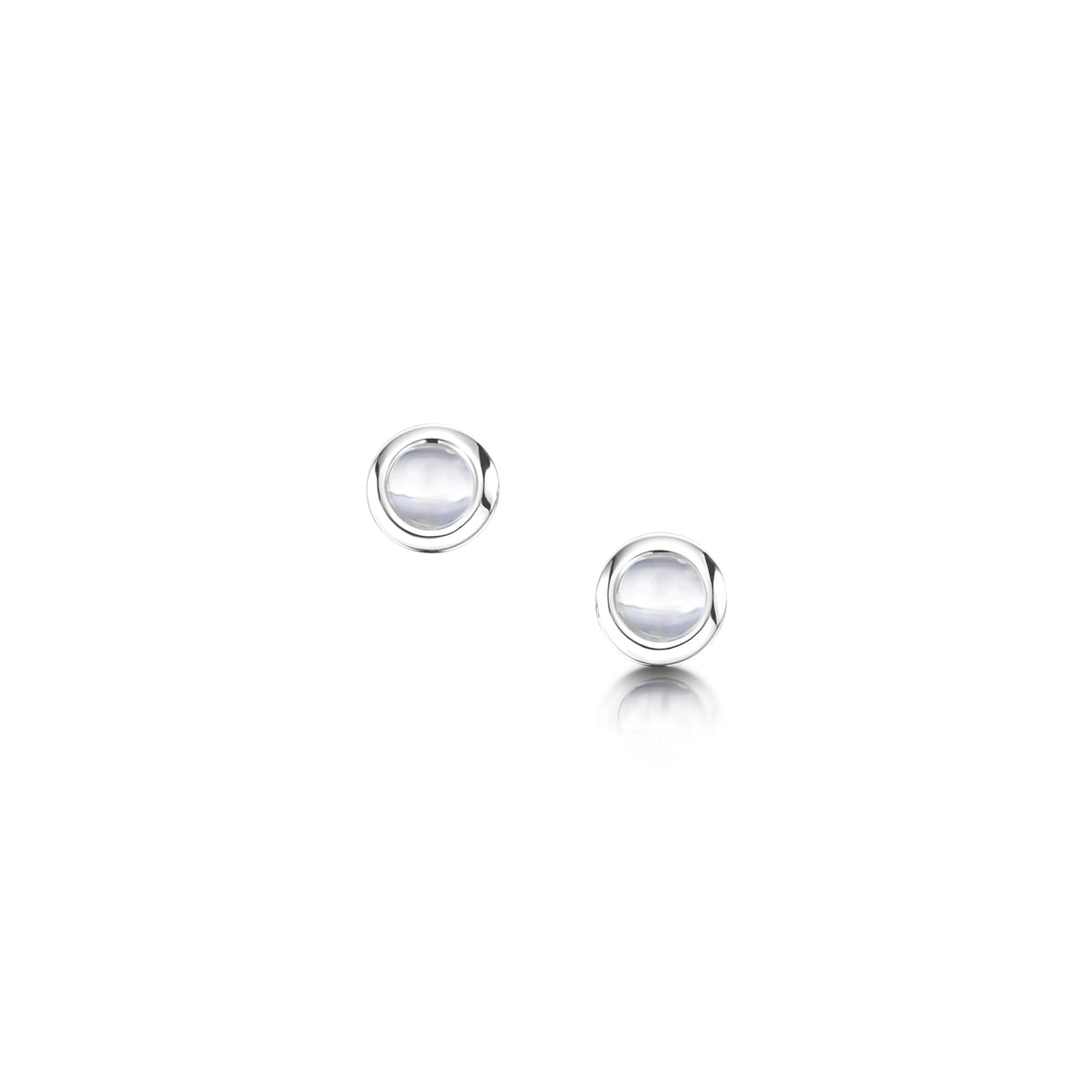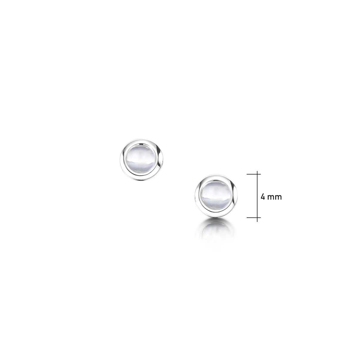 These contemporary solitaire stud earrings in sterling silver are hand-set with a 3mm moonstone. Each earring measures approximately 4mm in diameter.