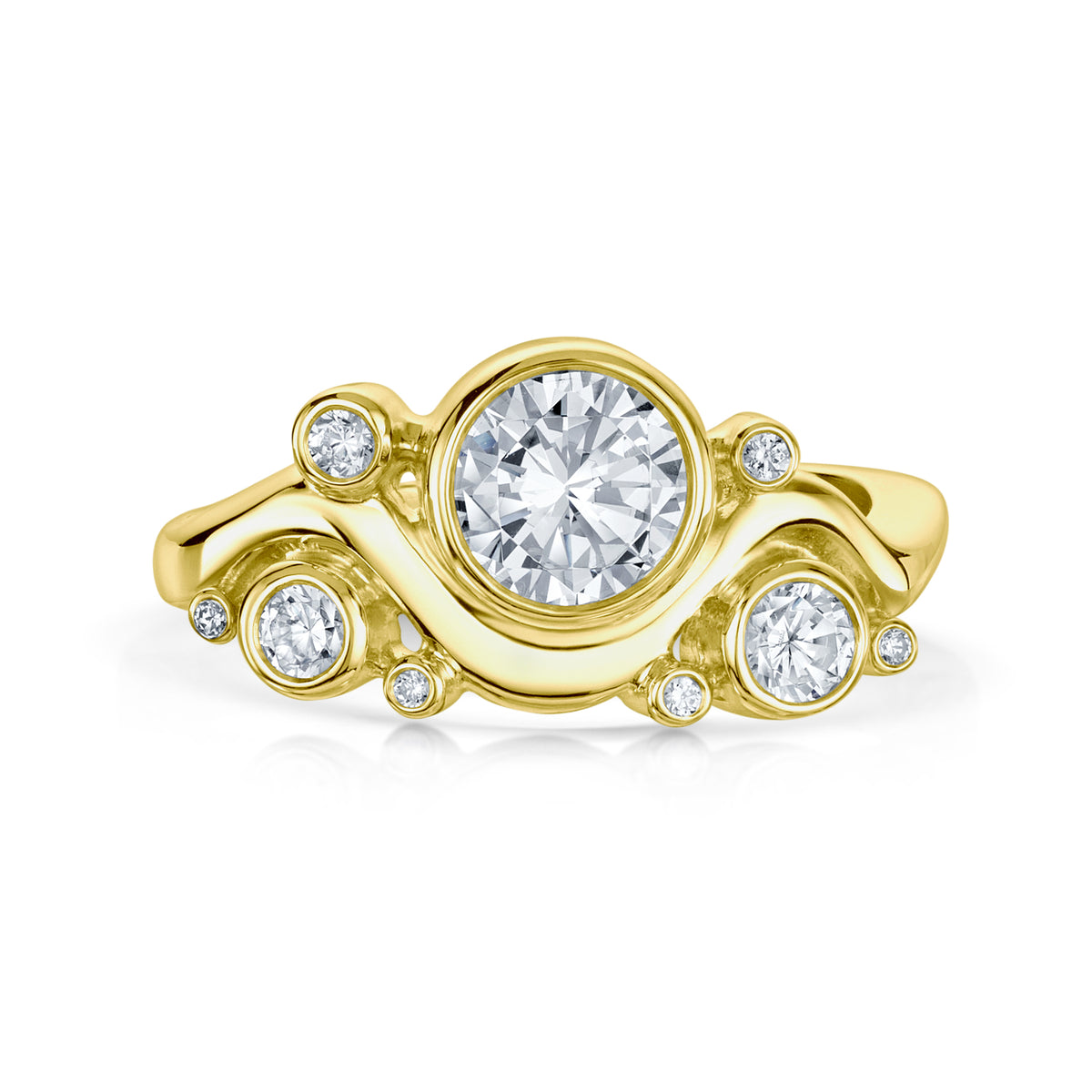 This stunning Super Cosmos ring in luxurious 18ct yellow gold features a sparkling 6.0mm/0.8ct diamond surrounded by a further eight diamonds, sized from 3.2mm down to 1.0mm. The gemstones total over 1.0 carat and are all expertly set by hand in our Orkney workshop.