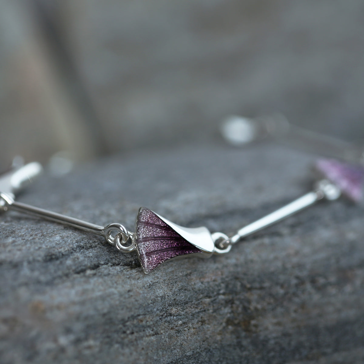 This sterling silver Symphony bracelet features four symphony links, hand-enamelled in Amethyst enamel in our Orkney workshop and connected with thin, solid silver bars.