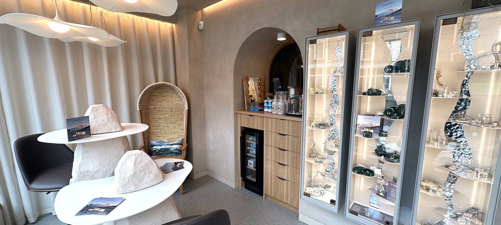 The interior represents Sheila’s love for geology, taking inspiration from pyrite rock formations and the striking basalt rock upon which sits Edinburgh Castle. “My love of rocks and gemstones started when I was at Edinburgh Art College in the 60s”, said Sheila. “I joined the Leith Lapidary Club in 1964, where I made my first piece of jewellery, and the rest is history!”.