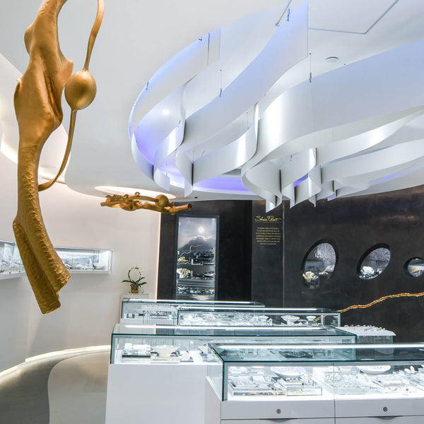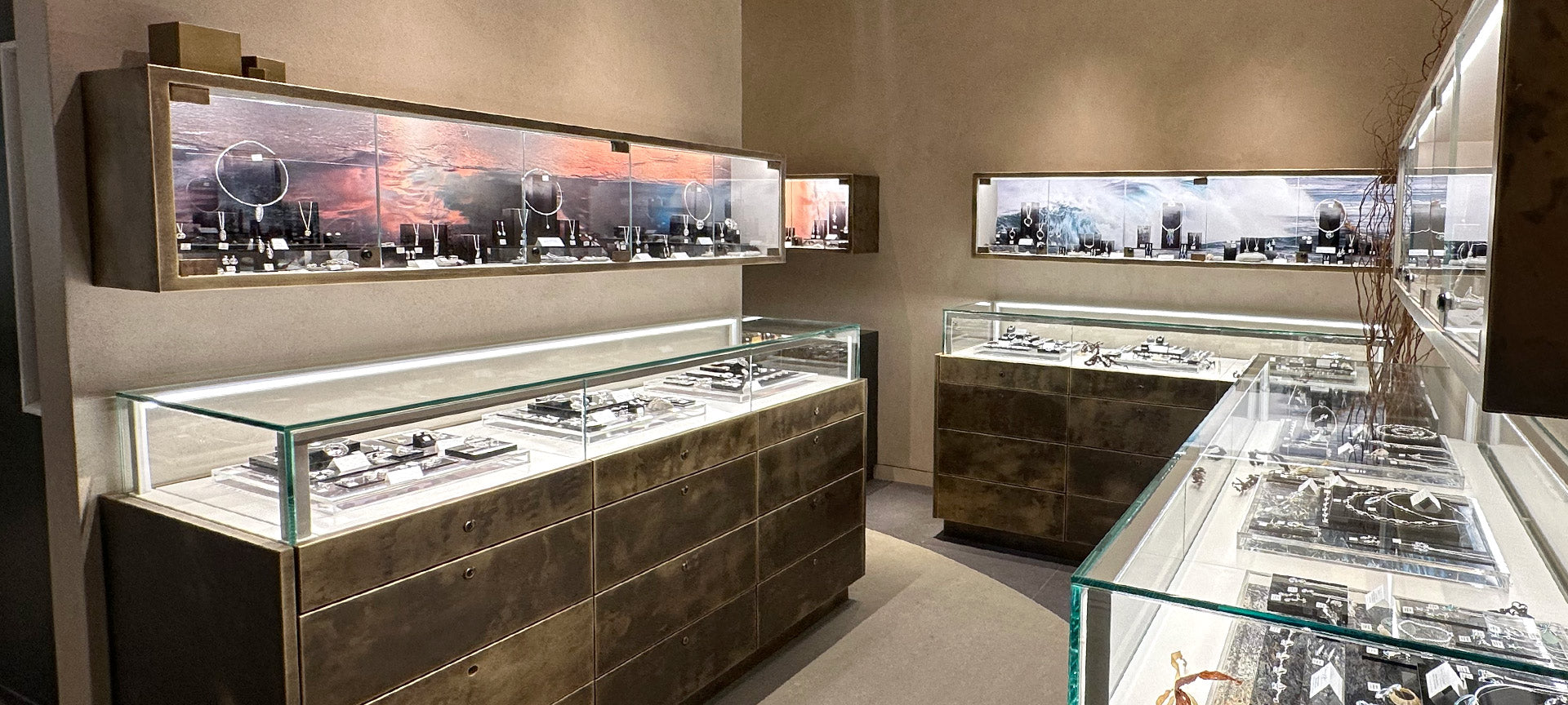 On the ground floor of the new Hanover Street premises, customers are welcomed with a dark, earthy ambiance featuring rich natural textures. Discover Sheila’s iconic designs within a striking wall display evoking the structure of pyrite rock.