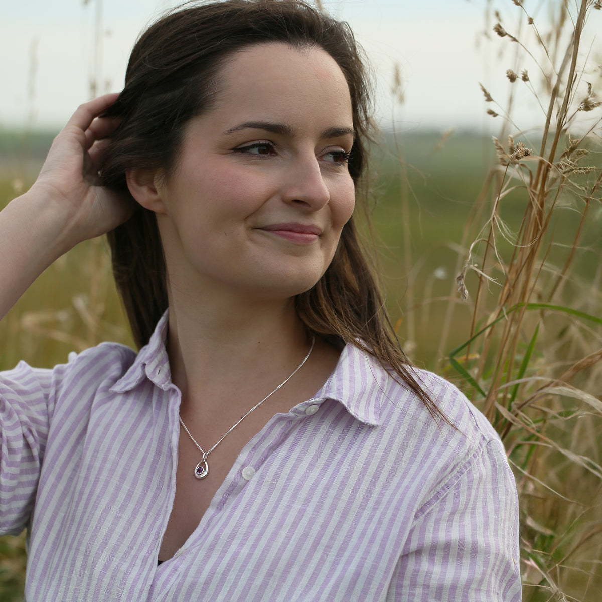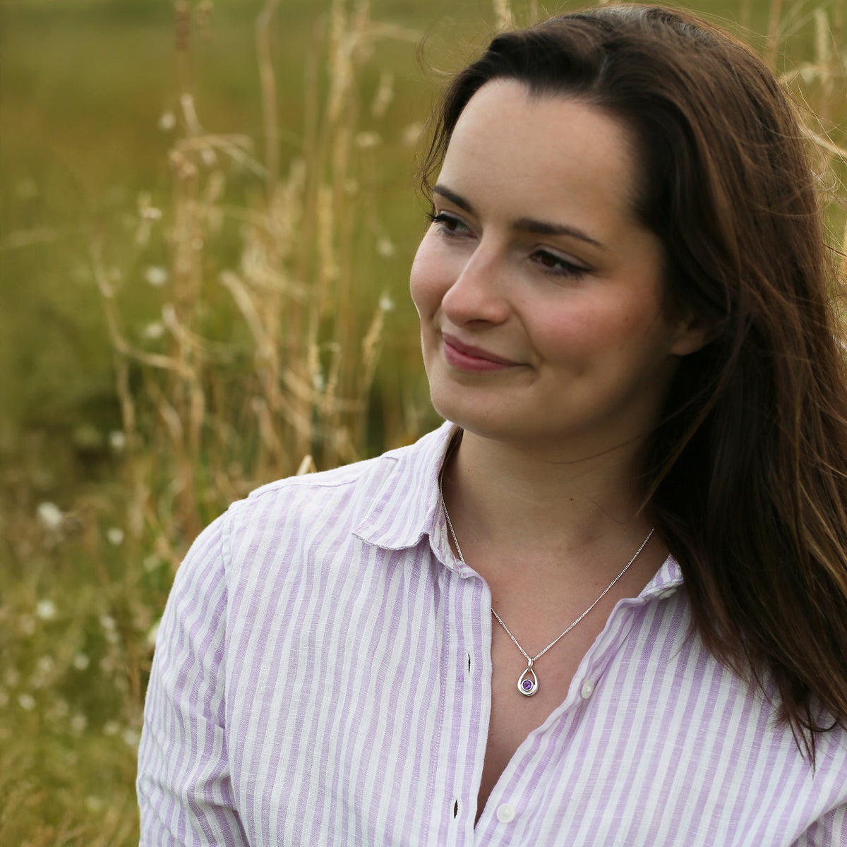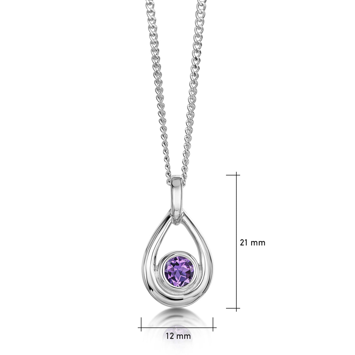The droplet design in this small silver birthstone necklace is hand-set with a 5.5mm amethyst and measures approximately 21mm by 21mm. The pendant hangs elegantly from a sterling silver chain.