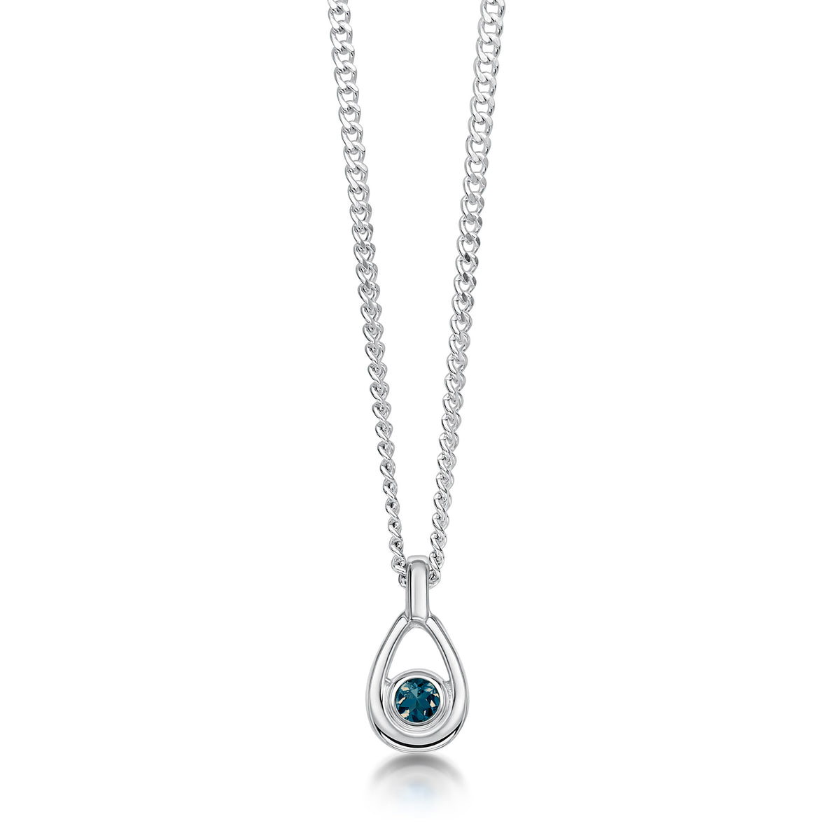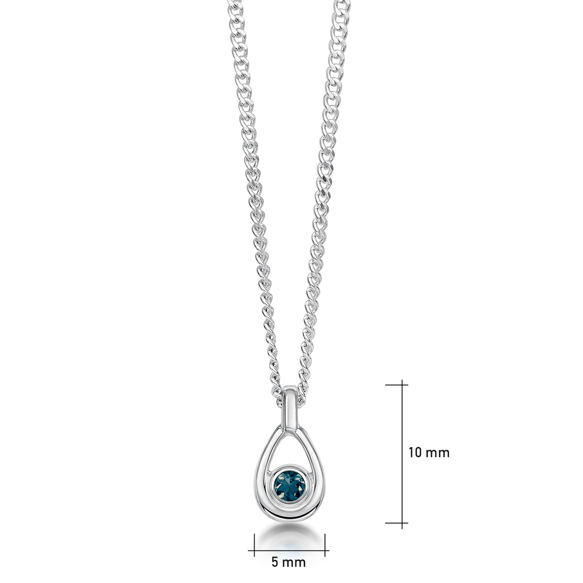 The droplet design in this petite silver birthstone necklace is hand-set with a 2.5mm London blue topaz and measures approximately 5mm by 10mm. The pendant hangs elegantly from a sterling silver chain.