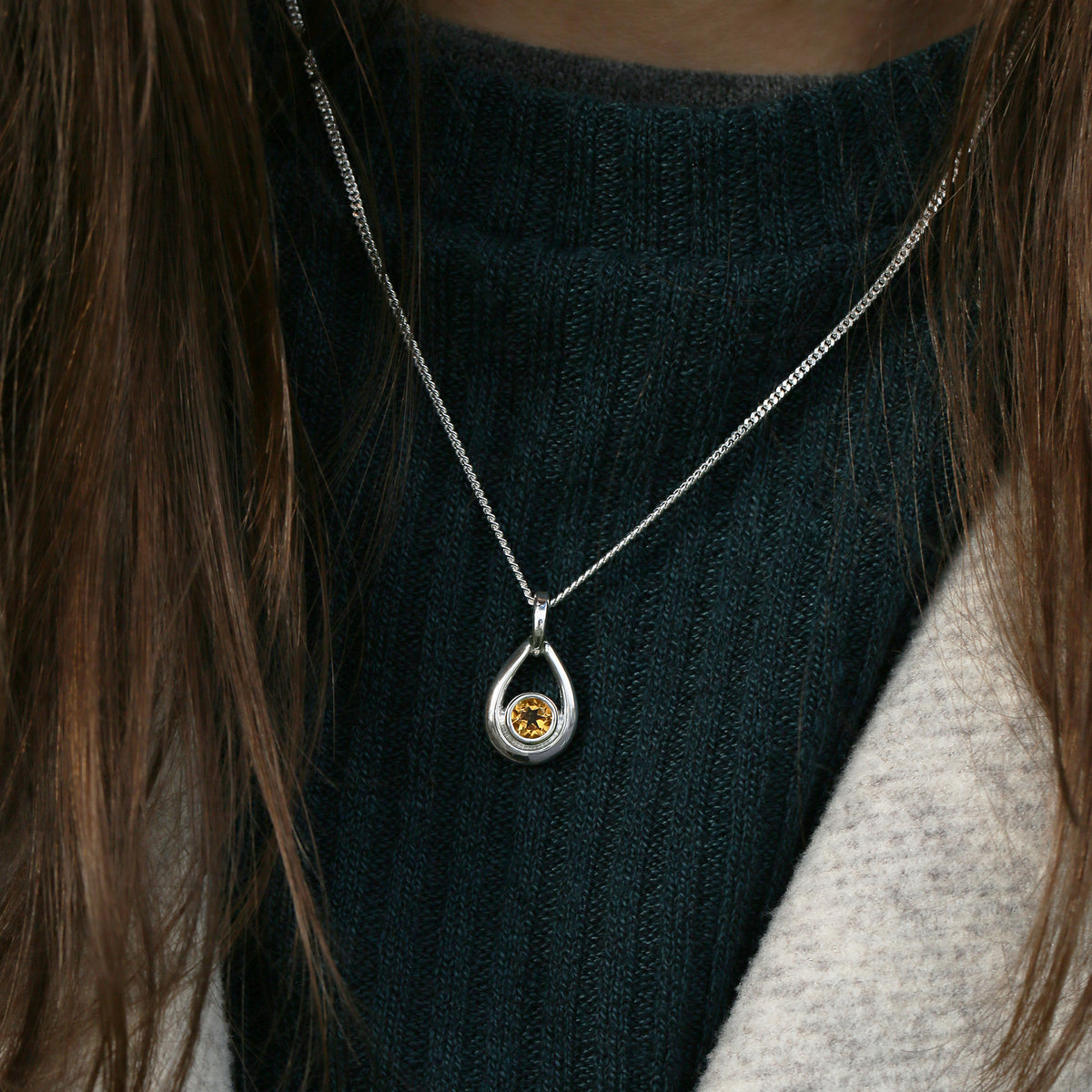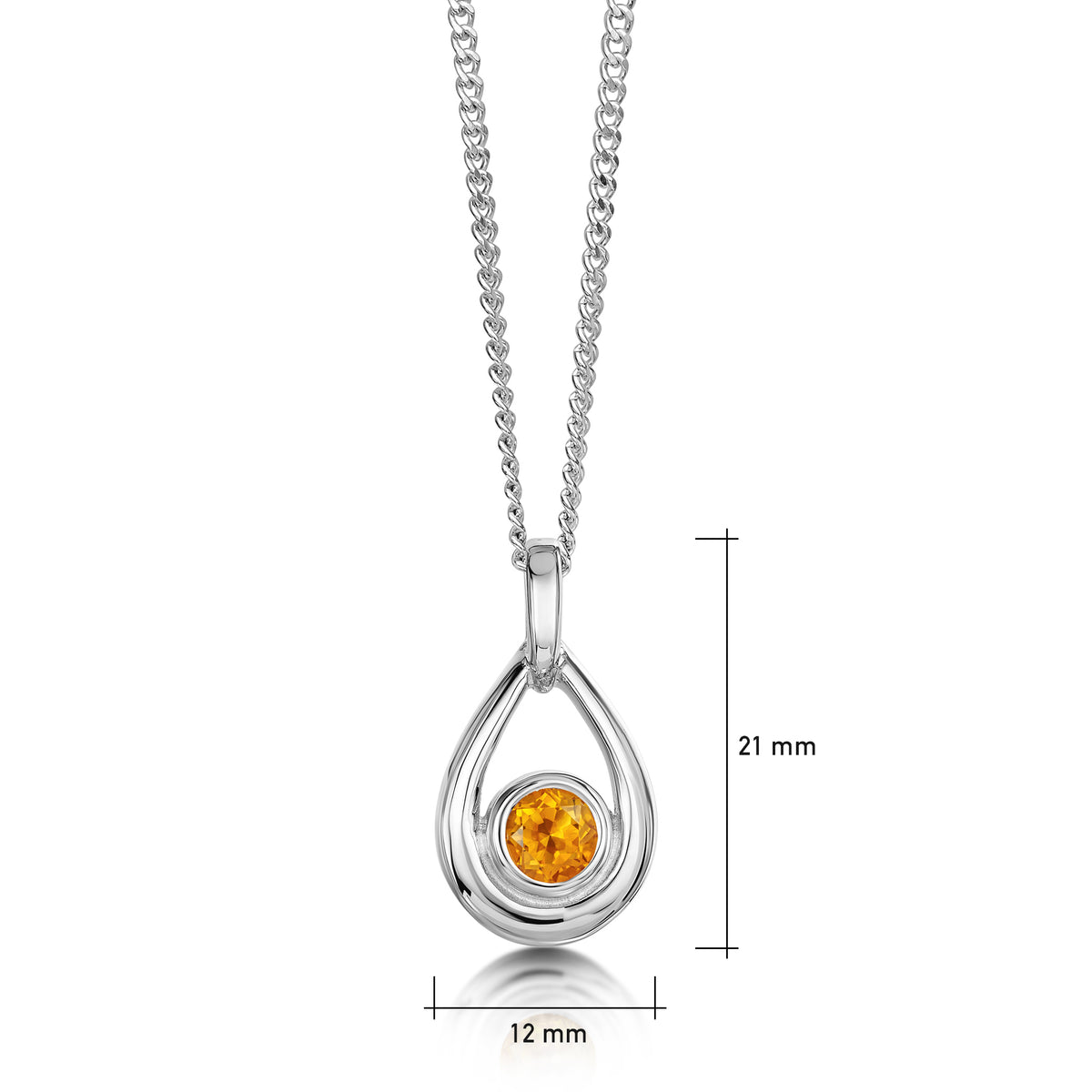 The droplet design in this small silver birthstone necklace is hand-set with a 5.5mm citrine and measures approximately 21mm by 21mm. The pendant hangs elegantly from a sterling silver chain.