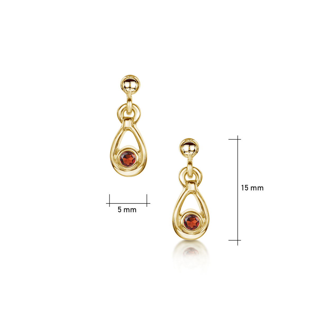 These birthstone droplet earrings in classic 9ct yellow gold are each hand set with a 2.5mm garnet and measure approximately 5mm by 15mm. The earrings hang from yellow gold drop studs.
