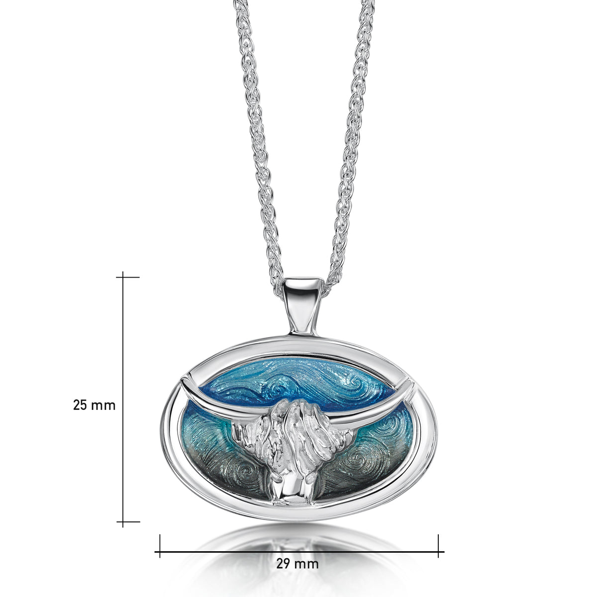 This Highland Cow pendant in sterling silver features the animal's iconic head and horns set against a background of 'Daylight' enamel. The pendant design measures approximately 29mm by 25mm and hangs from a silver wheat chain.