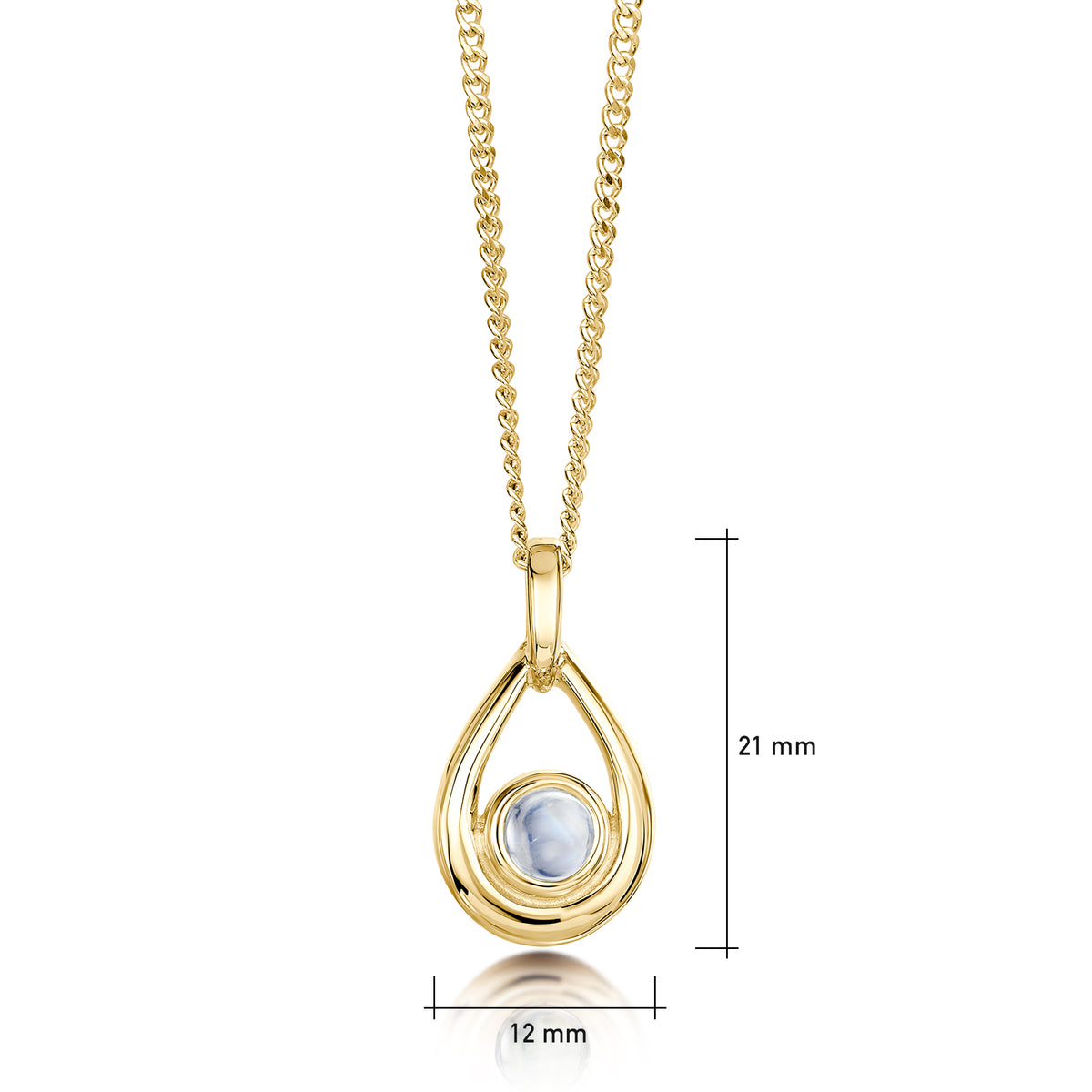 The droplet design in this small birthstone necklace is rendered in classic 9ct yellow gold and is hand-set with a 5.5mm moonstone. The pendant measures approximately 21mm by 21mm and hangs elegantly from a yellow gold chain.
