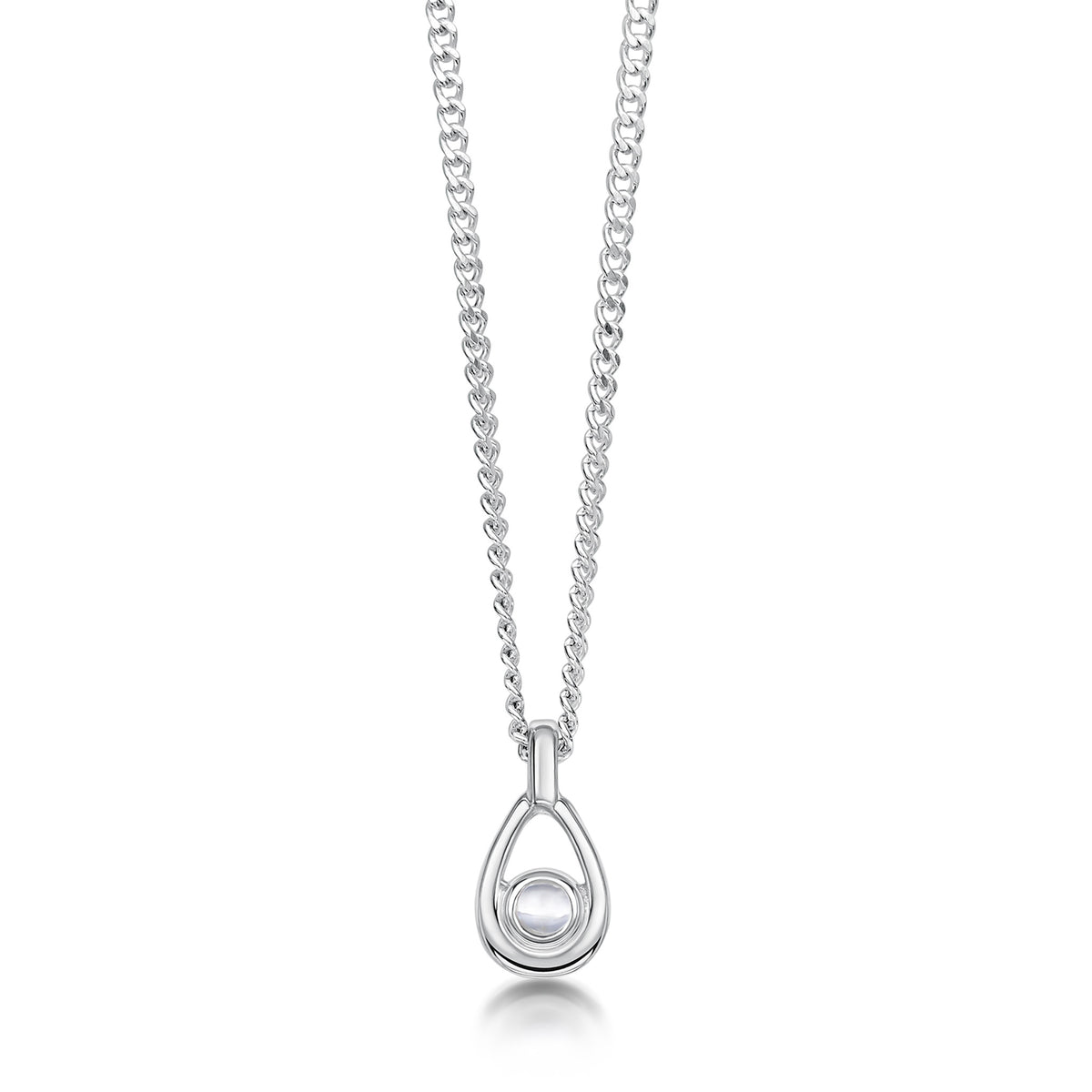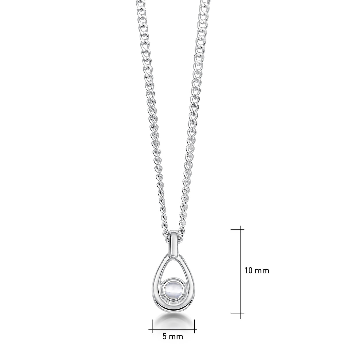 The droplet design in this petite silver birthstone necklace is hand-set with a 2.5mm moonstone and measures approximately 5mm by 10mm. The pendant hangs elegantly from a sterling silver chain.