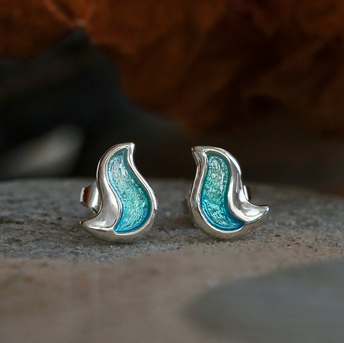 These petite River Ripples stud earrings in sterling silver are hand-enamelled in Shallows enamel in our Orkney workshop and each measure approximately 10mm high.