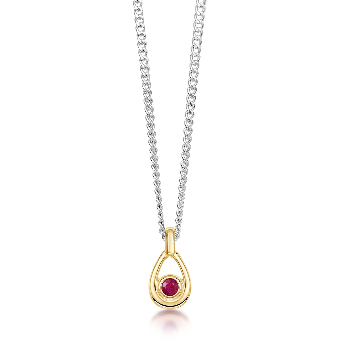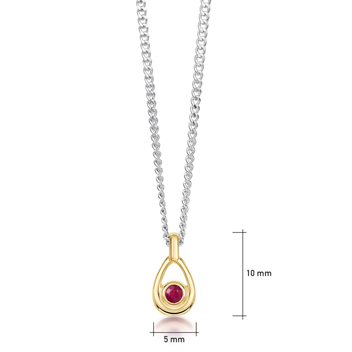 This petite birthstone droplet necklace in classic 9ct yellow gold is hand-set with a 2.5mm ruby and measures approximately 5mm by 10mm. The pendant hangs elegantly from a sterling silver chain.