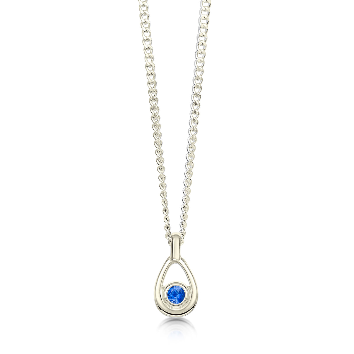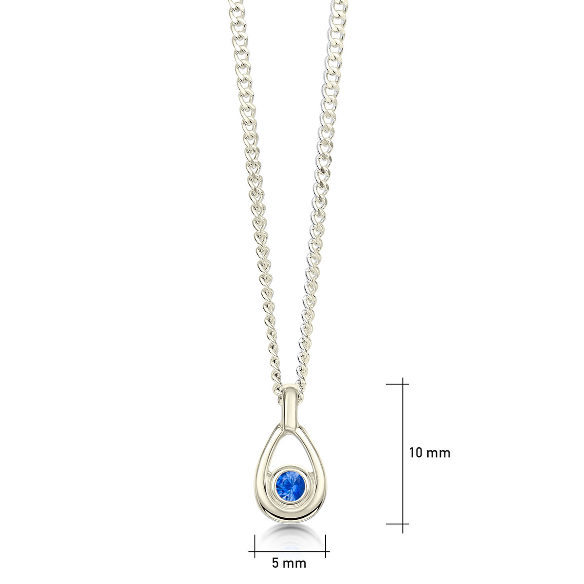 This petite birthstone droplet necklace in elegant 9ct white gold is hand-set with a beautiful 2.5mm blue sapphire and measures approximately 5mm by 10mm. The pendant hangs from a 9ct white gold chain.