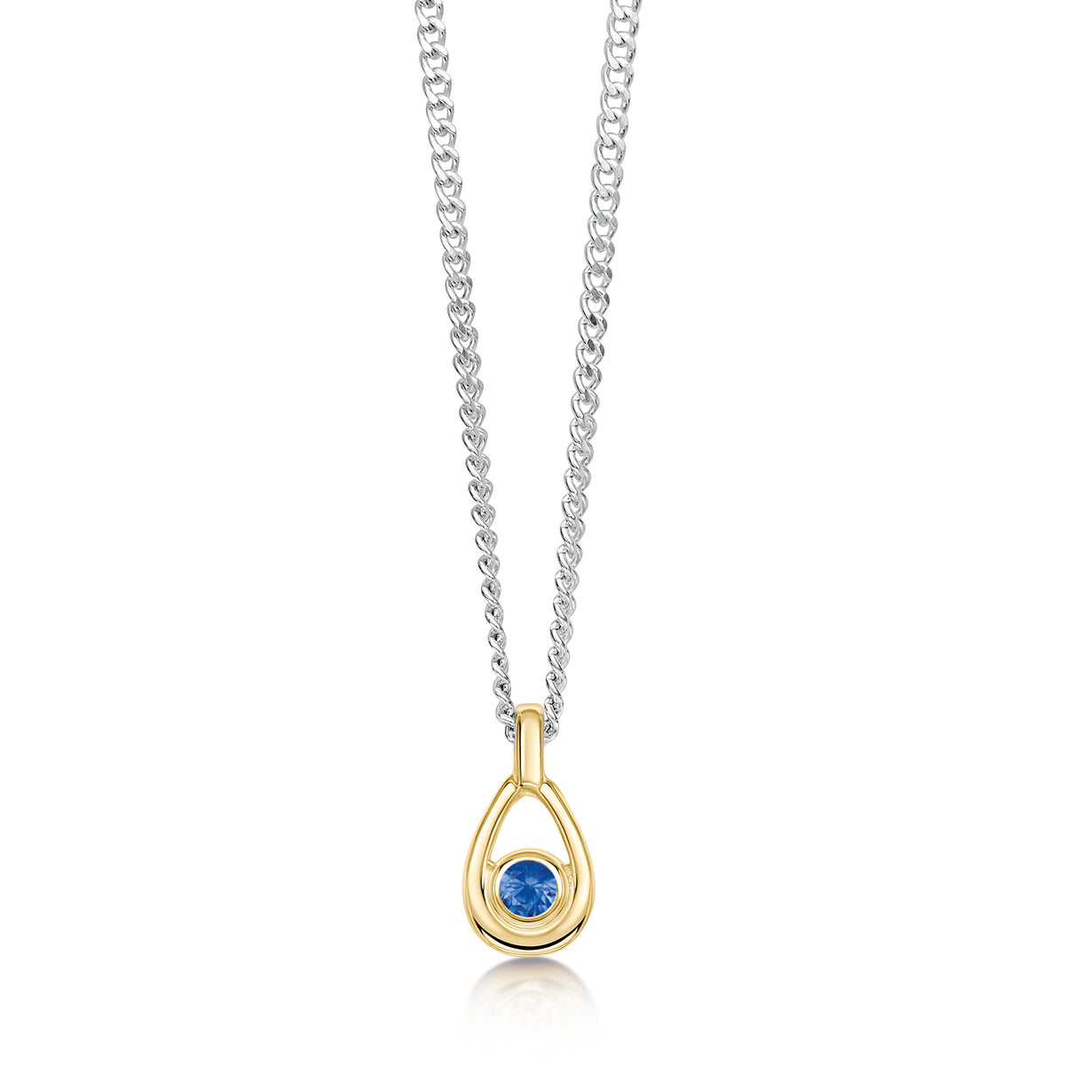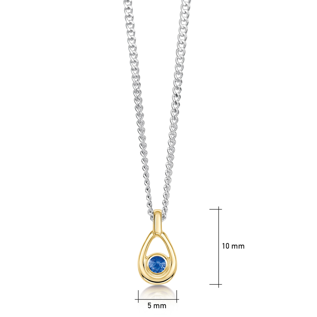 This petite birthstone droplet necklace in classic 9ct yellow gold is hand-set with a 2.5mm blue sapphire and measures approximately 5mm by 10mm. The pendant hangs elegantly from a sterling silver chain.