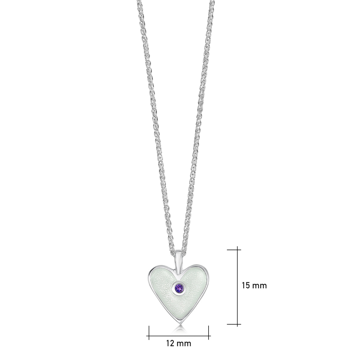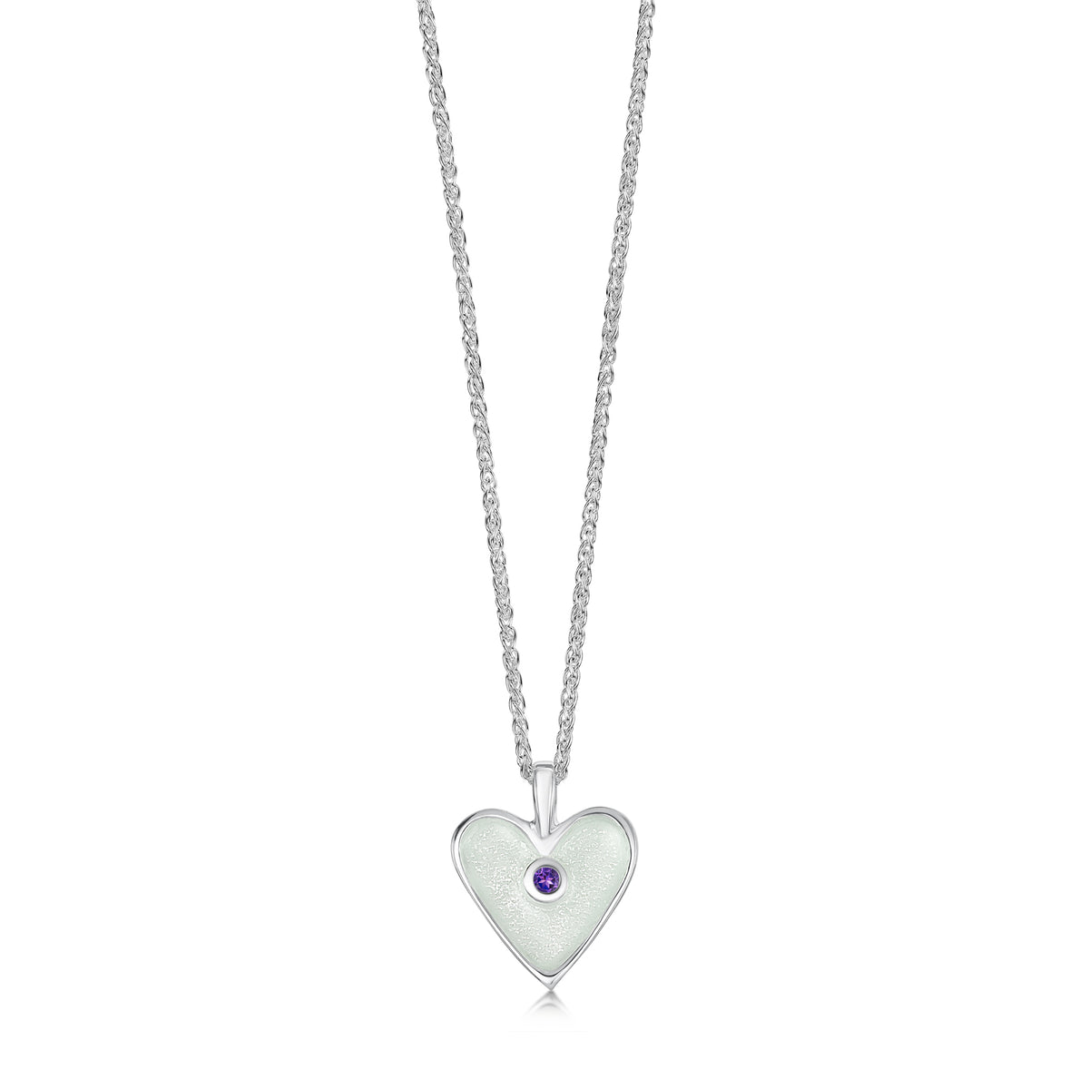 This Secret Hearts birthstone pendant in sterling silver features a single enamelled heart design, delicately hanging from a silver wheat chain, and beautifully enhanced with a 2mm amethyst. The design is hand-enamelled in Crystal enamel in our Orkney workshop and measures approximately 11mm wide with a 15mm drop.