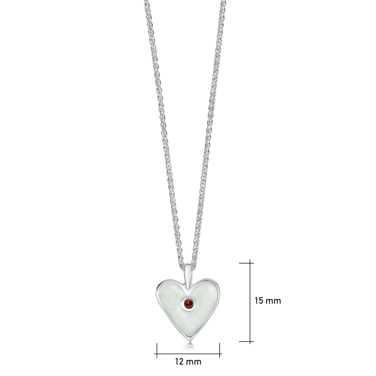 This Secret Hearts birthstone pendant in sterling silver features a single enamelled heart design, delicately hanging from a silver wheat chain, and beautifully enhanced with a 2mm garnet. The design is hand-enamelled in Crystal enamel in our Orkney workshop and measures approximately 11mm wide with a 15mm drop.