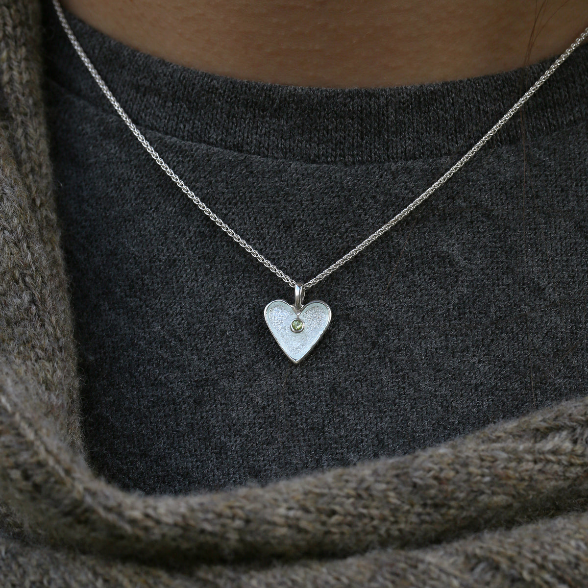 This Secret Hearts birthstone pendant in sterling silver features a single enamelled heart design, delicately hanging from a silver wheat chain, and beautifully enhanced with a 2mm peridot. The design is hand-enamelled in Crystal enamel in our Orkney workshop and measures approximately 11mm wide with a 15mm drop.