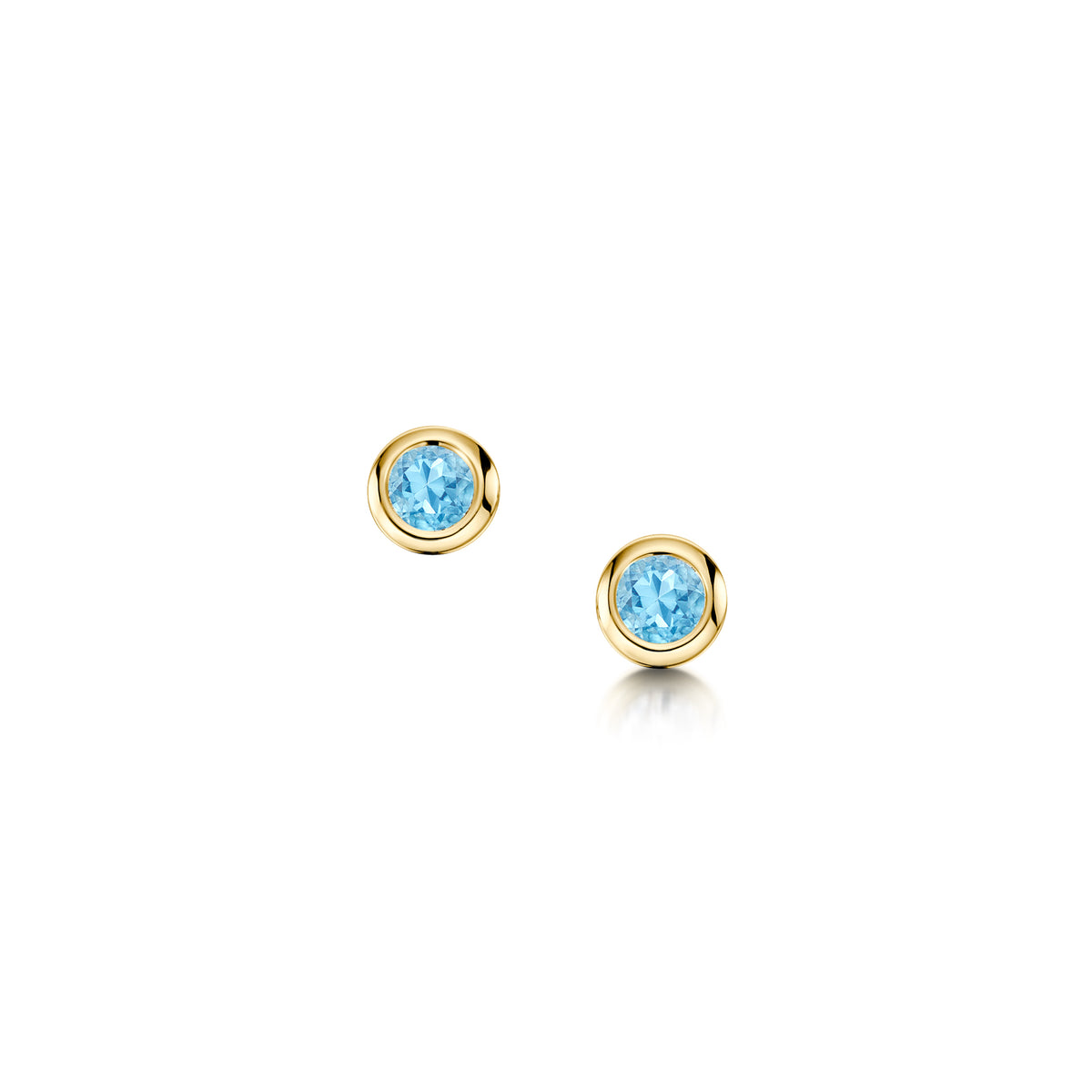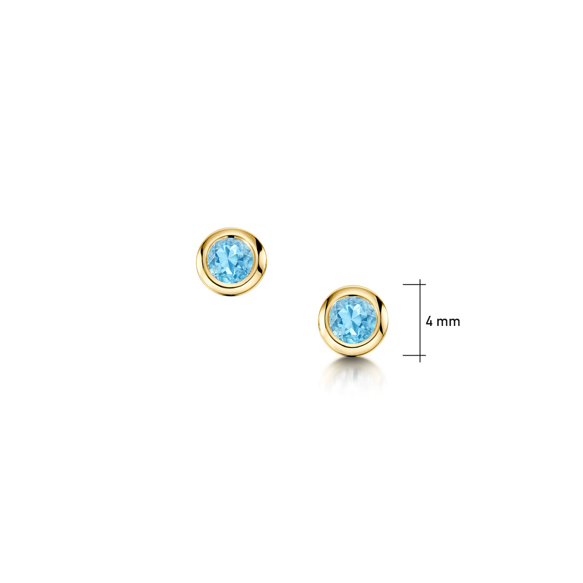 These contemporary solitaire stud earrings in classic 9ct Yellow Gold are hand-set with a 3mm blue topaz. Each earring measures approximately 4mm in diameter.