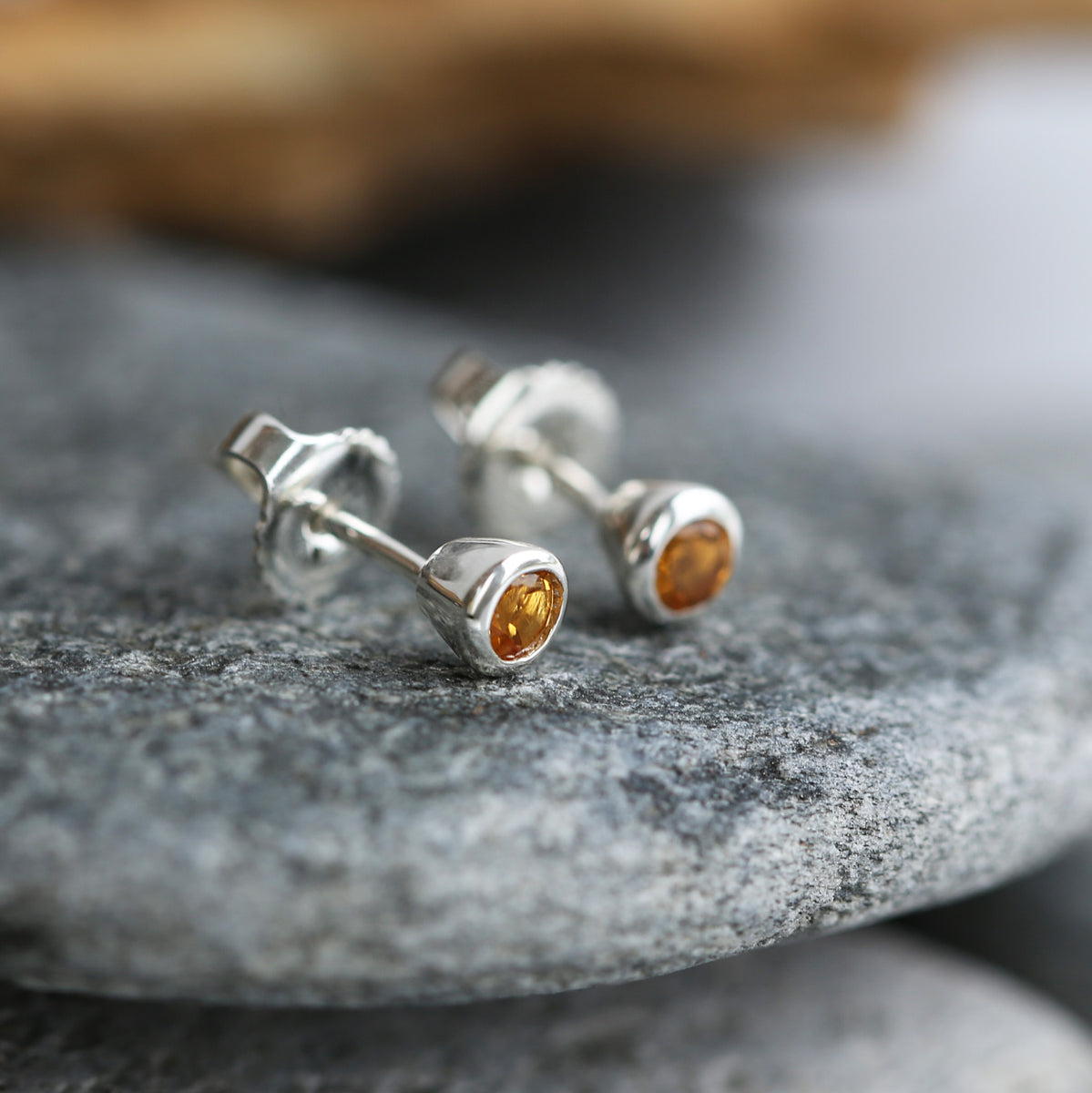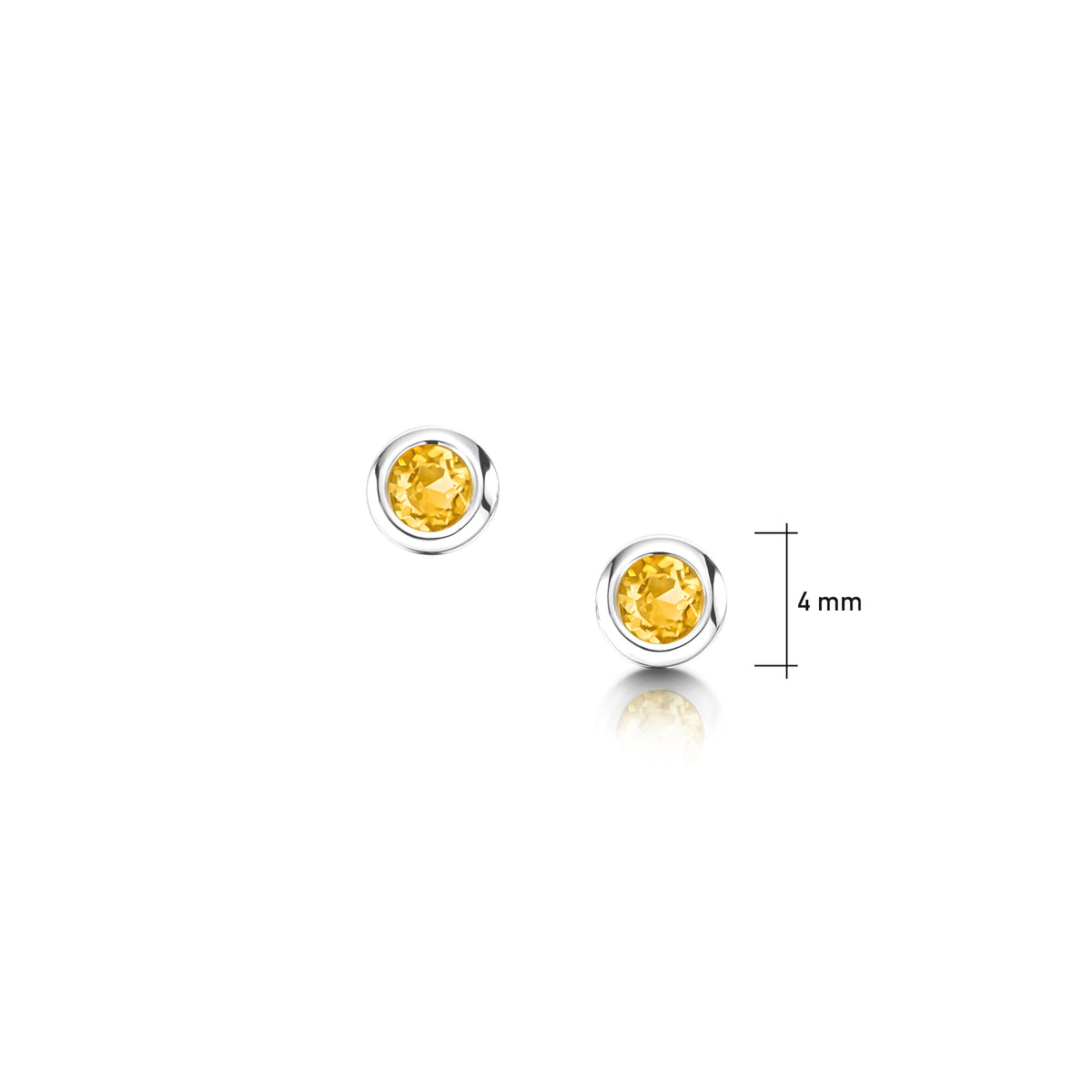 These contemporary solitaire stud earrings in sterling silver are hand-set with a 3mm citrine. Each earring measures approximately 4mm in diameter.