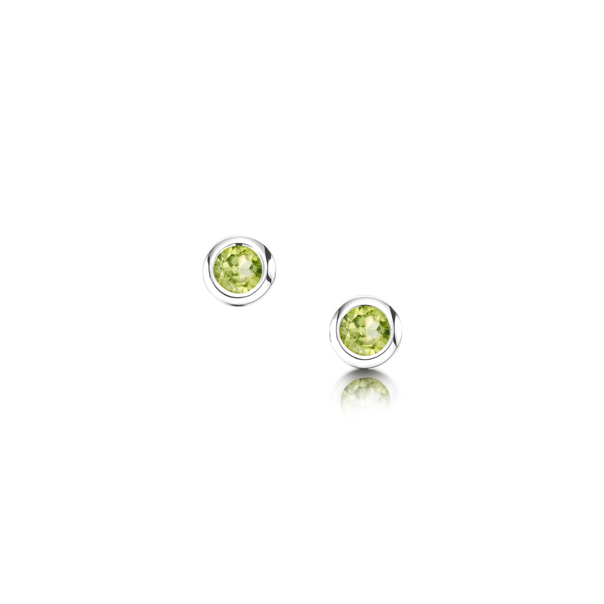 These contemporary solitaire stud earrings in sterling silver are hand-set with a 3mm peridot. Each earring measures approximately 4mm in diameter.